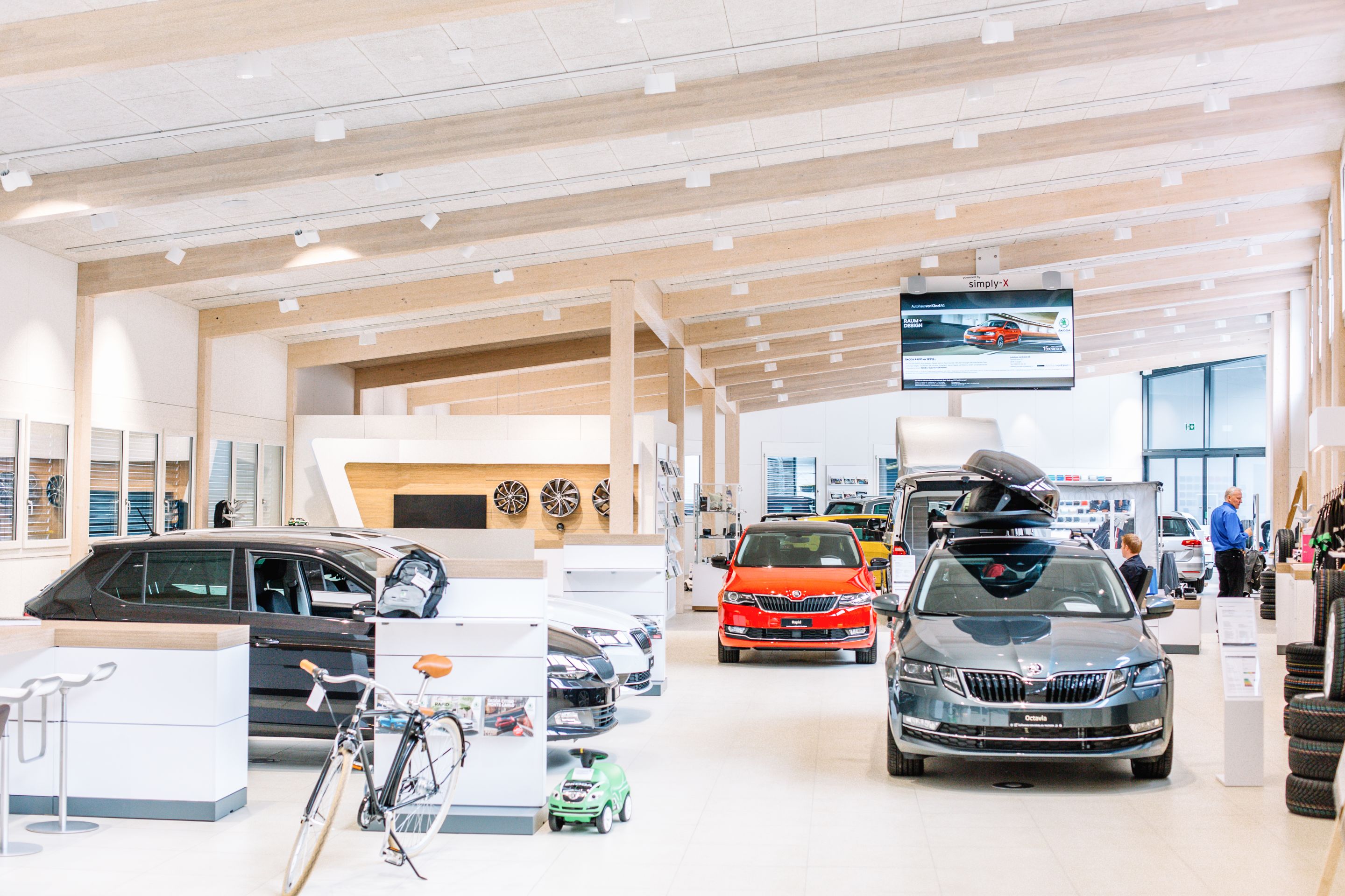 Das neue Ausstellungsgebäude beim Autohaus von Känel kann sich sehen lassen. Die Holzkonstruktion aus Fichte und Esche überspannt den Ausstellungsraum für die Skoda-Fahrzeuge. Der Aufbau von Holz-Innenverkleidungen und Metall-Aussenverkleidungen sowie Sandwich-Dachelementen zeigt die Leistungsfähigkeit von Hybridbauten und die kostengünstige Vorfertigung im Werk. Dank Elementbauweise und raschen Montagezeiten ist die Bauzeit kurz und präzise. Die Photovoltaikanlage auf dem Dach trägt zum nachhaltigen und natürlichen Image des Baustoffs Holz bei. Zudem macht der Strom aus Sonnenlicht das Gebäude praktisch energieautark.