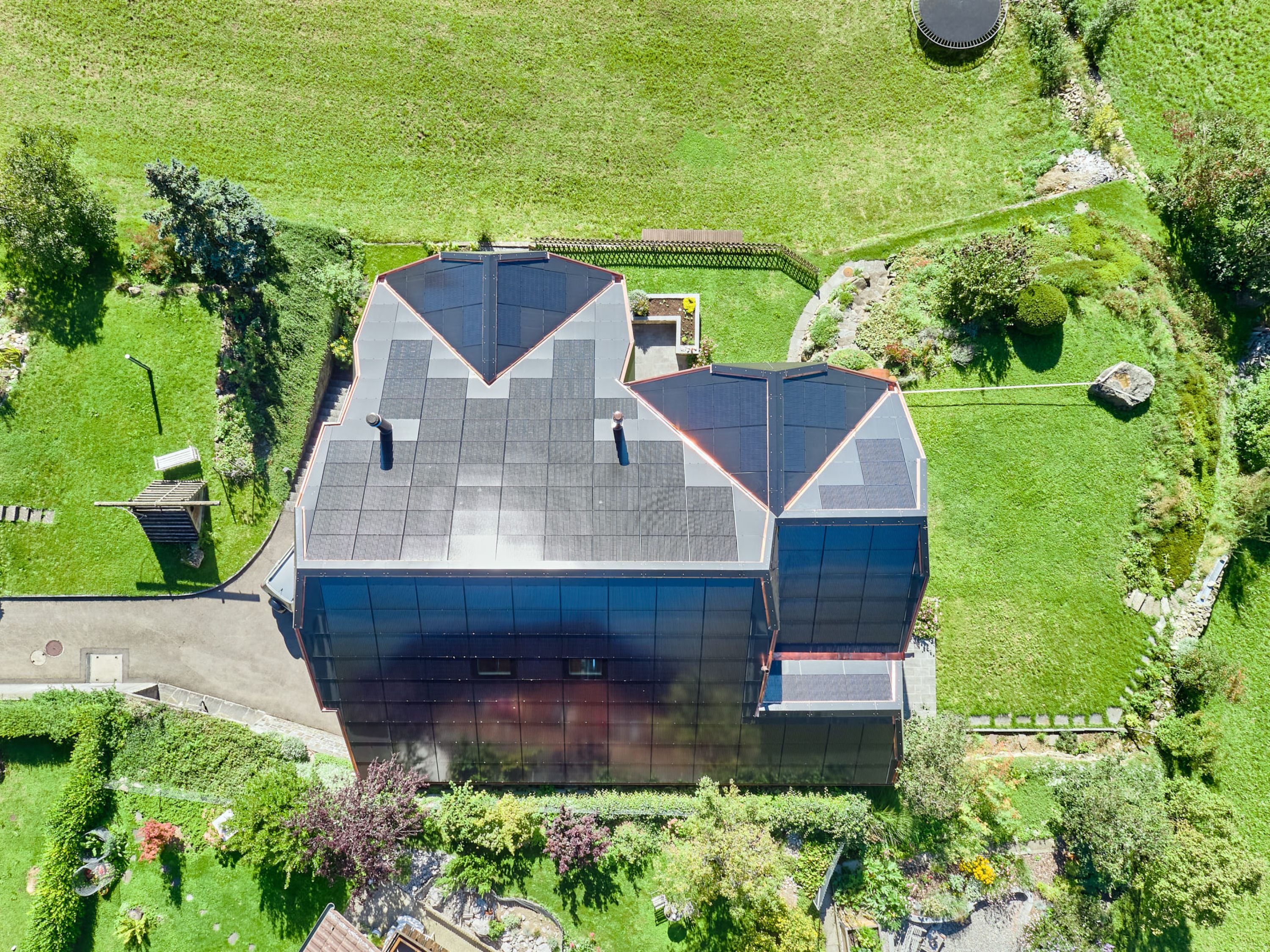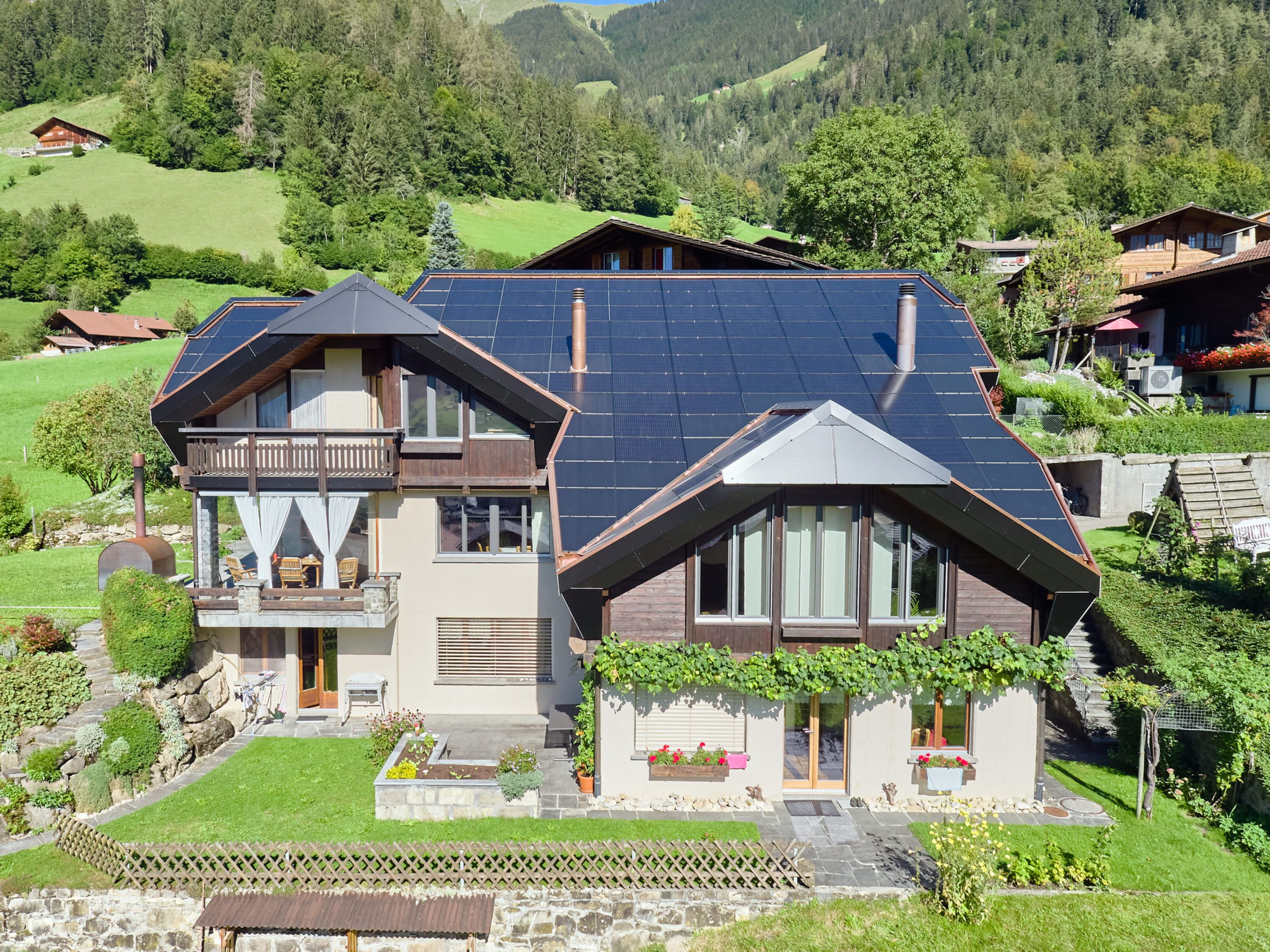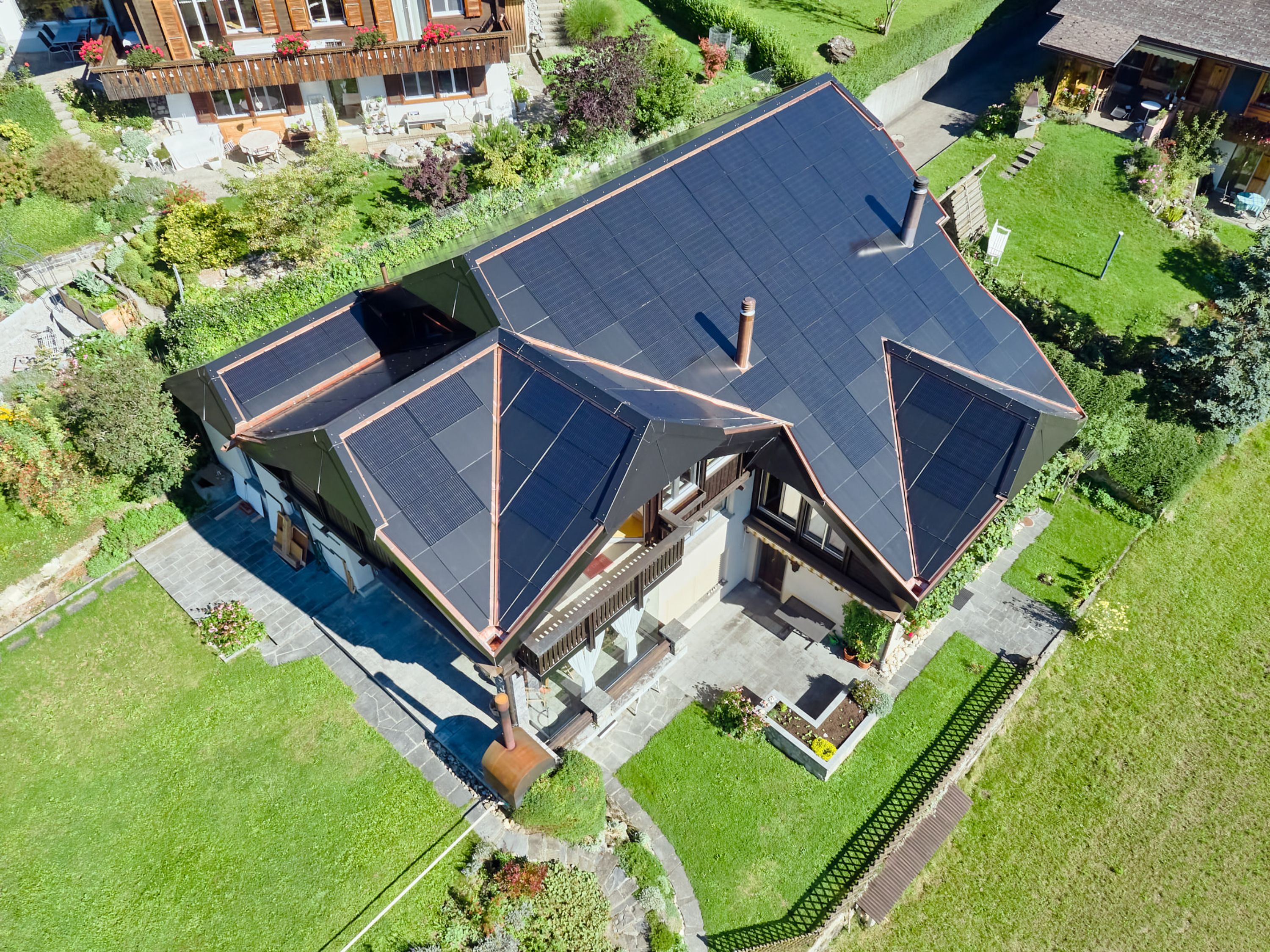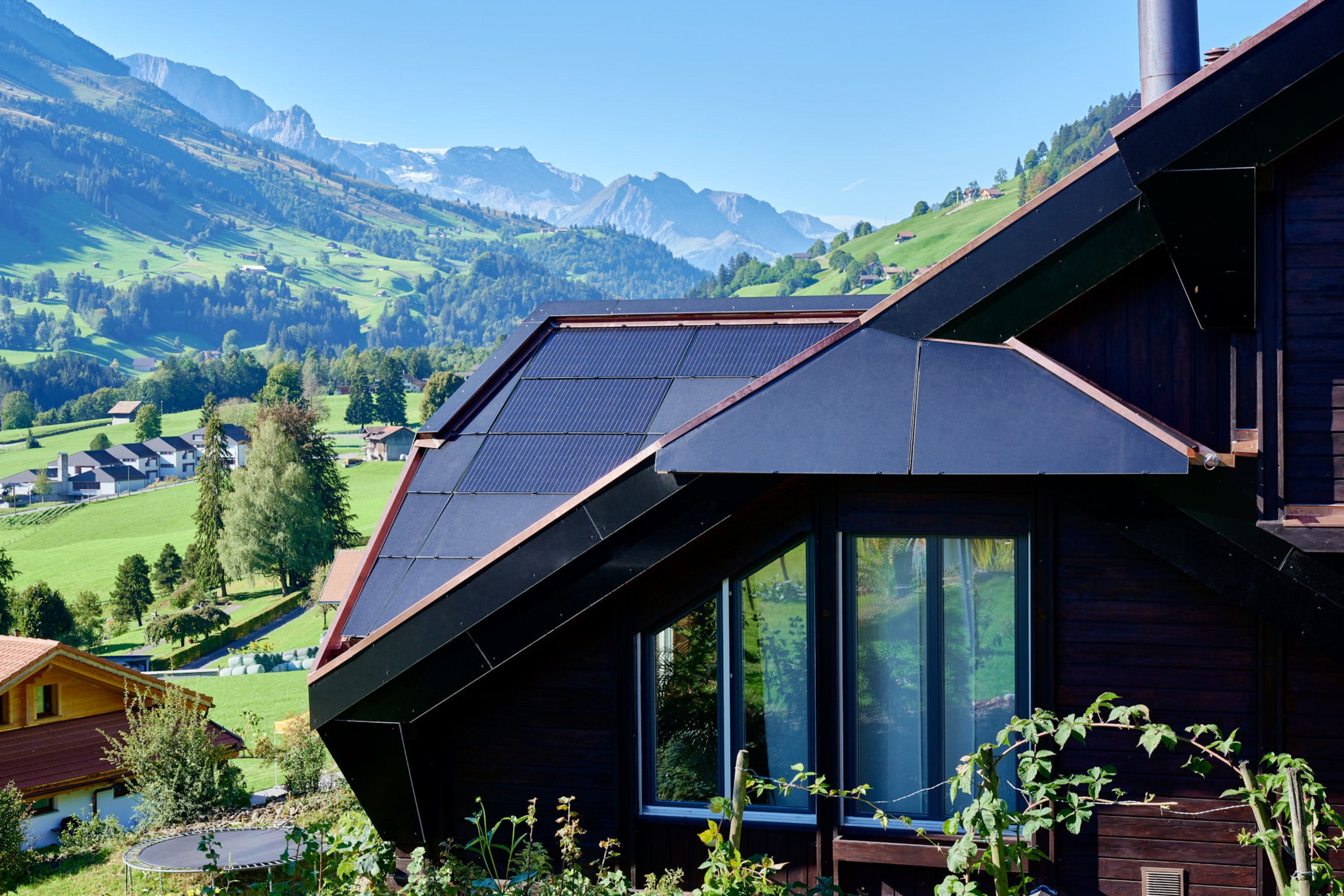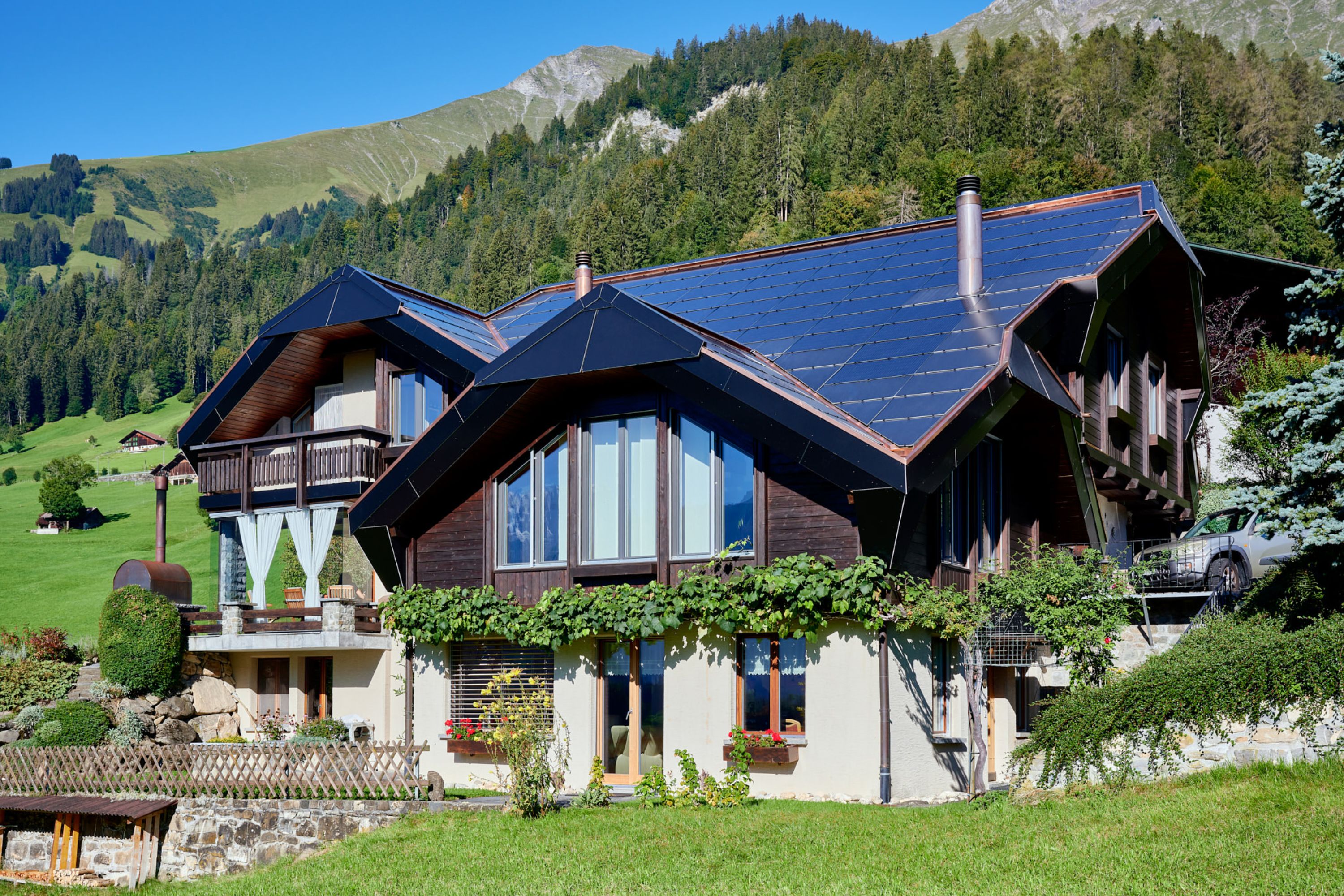 Der Umbau des 80-er-Jahre Hauses einer Frutiger Familie stellte die Allenbach Holzbau und Solartechnik AG vor ganz besondere Herausforderungen. Die Besitzer, Isabelle und Andreas Moser-Rieder, hatten einen Plan: Der Umbau ihres Hauses würde als Referenzobjekt für eine maximale Energieoptimierung dienen. Dabei sollten unter anderem alle Grundlagen für zukünftige Massnahmen zur Solarenergie-Nutzung, -Speicherung und -Aufbereitung geschaffen werden. Der Umbau startete im Frühjahr 2020 mit der Fenstersanierung und mit der Isolierung des Daches. Die Verbauung moderner Solarpanels, auf dem kompliziert verwinkelten Dach, bildete die zweite Stufe der energetisch optimierenden Sanierung. Neben den von Allenbach ausgeführten Arbeiten wurden verschiedenste Elektroleitungen und -installationen durch die Elektroplanungsfirma Buchs & Grossen AG geplant und umgesetzt. Der Umbau erfolgte immer in Zusammenarbeit mit den Solarholzbauern.