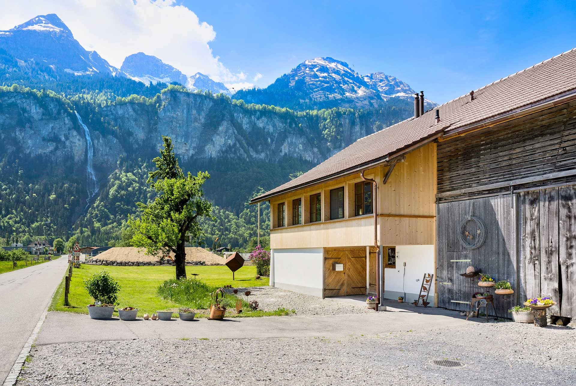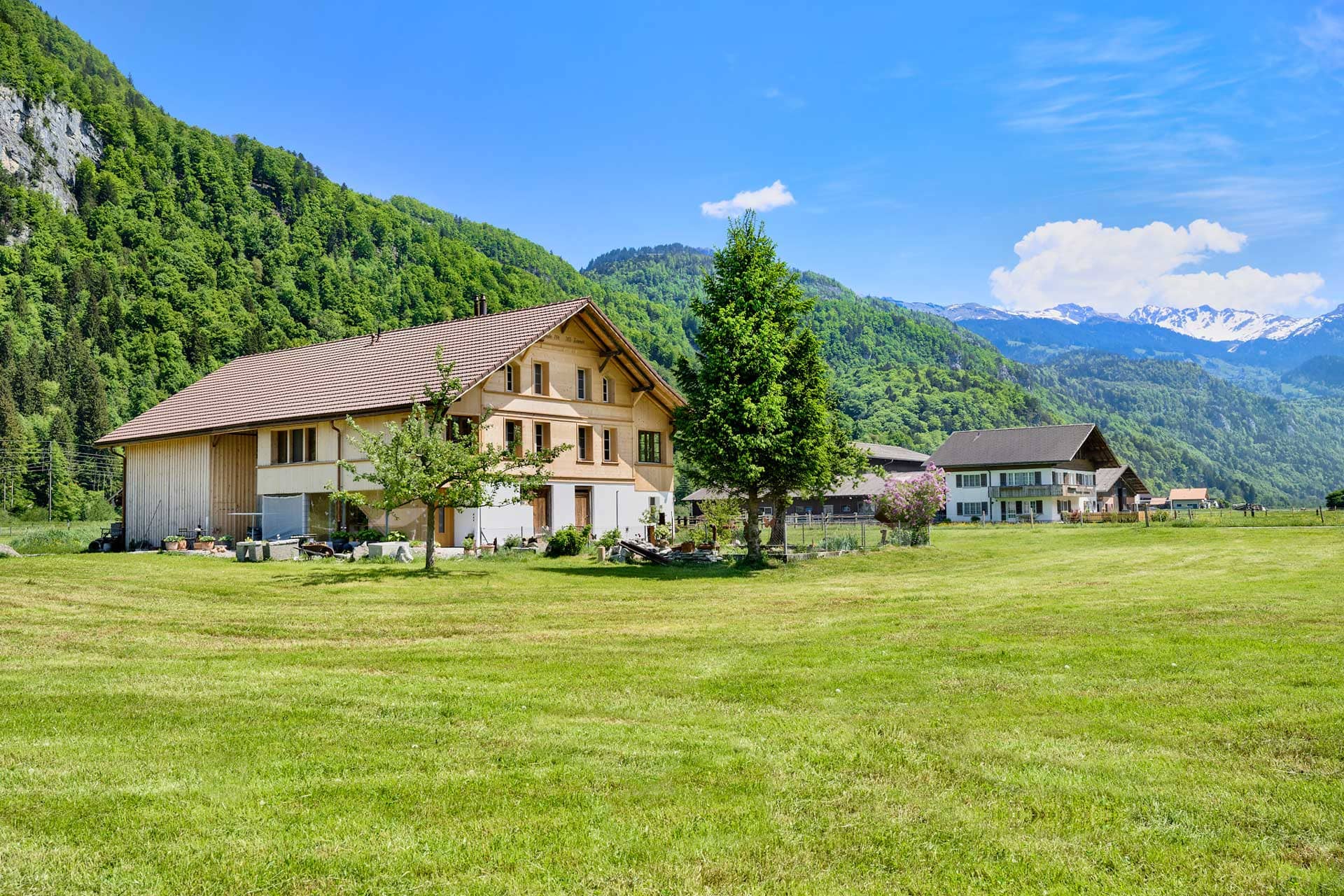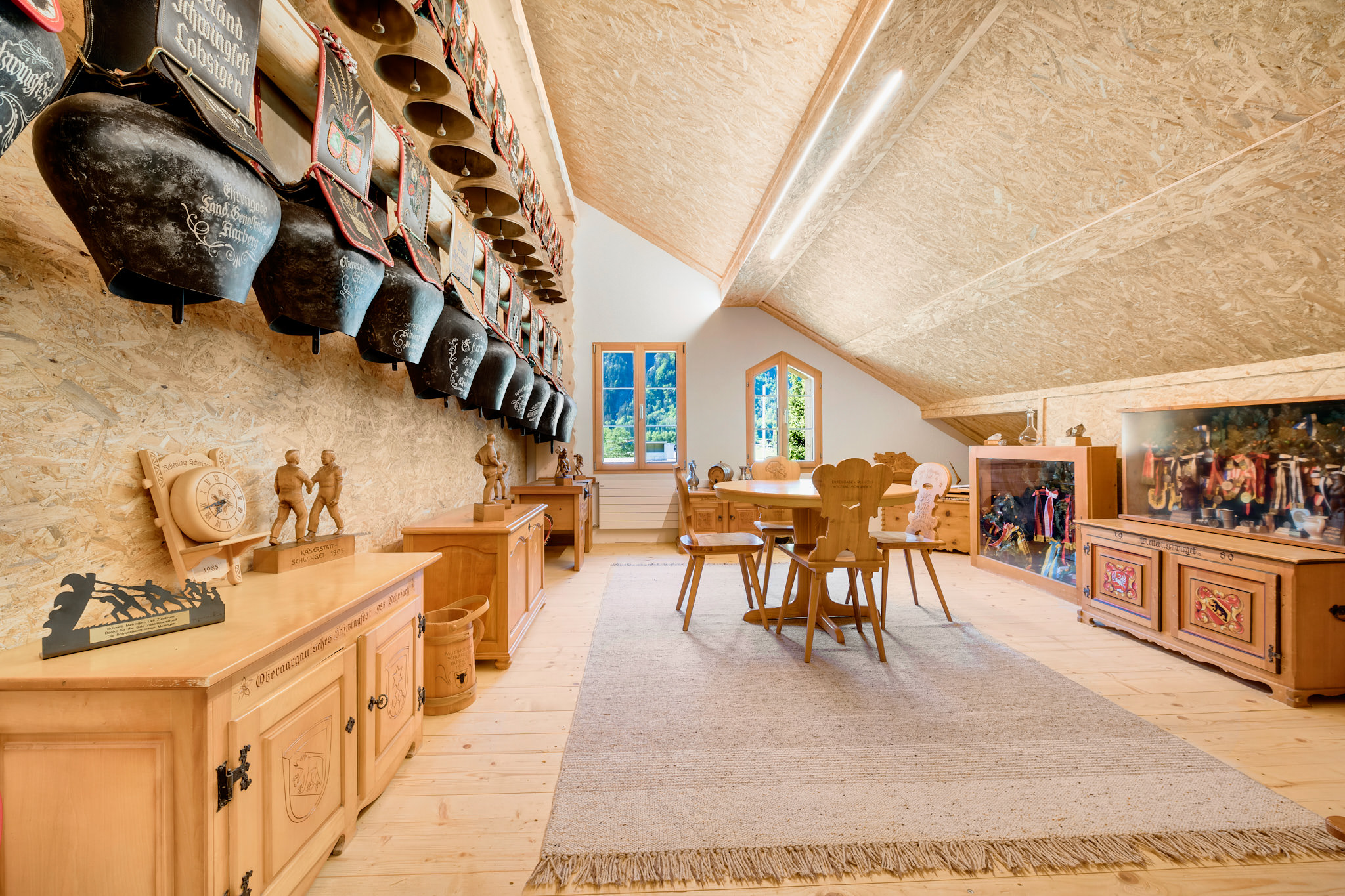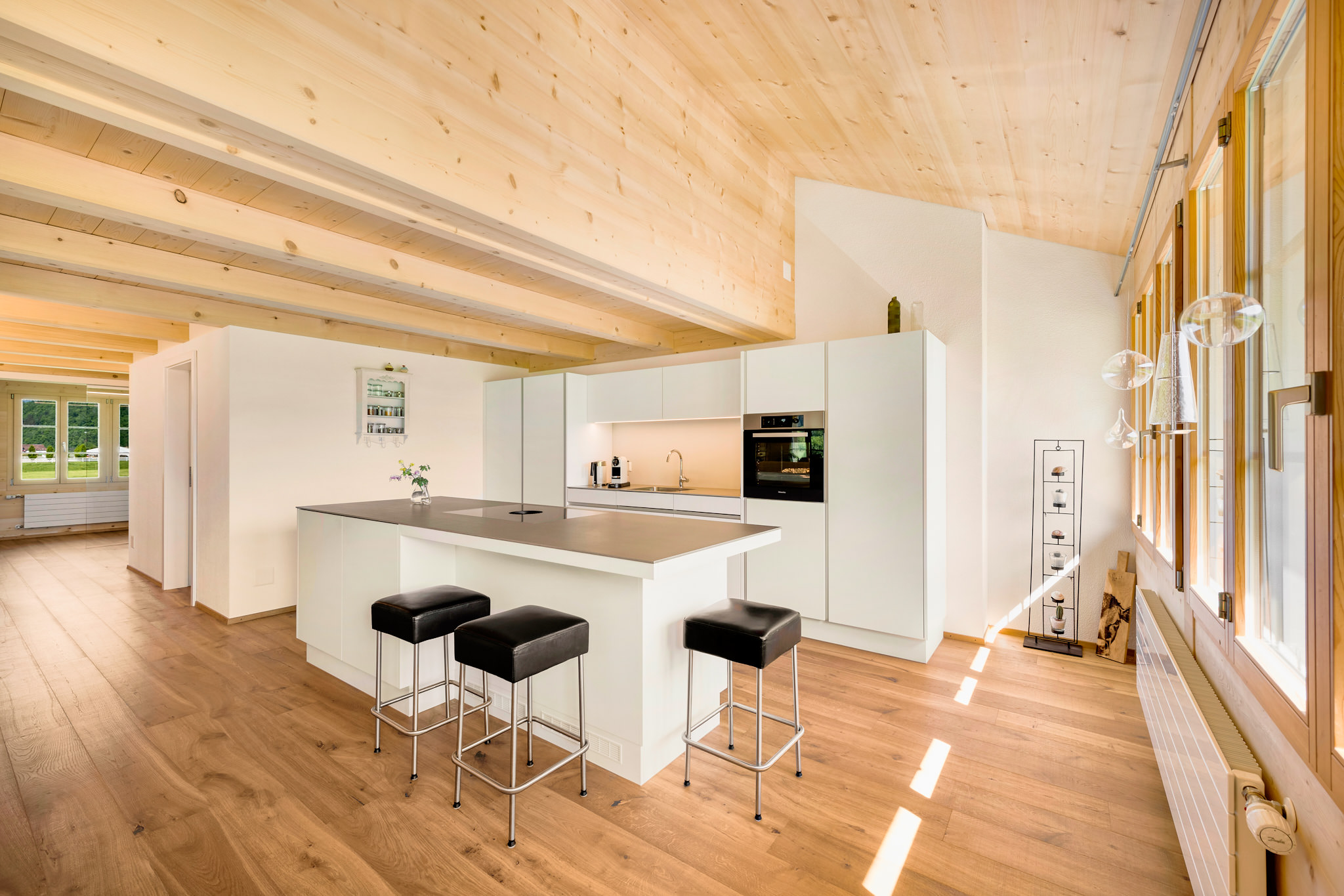 Ueli Zumbrunn weilt schon sein ganzes Leben auf dem Bauernhof Trutzenmäder 48 – unmittelbar neben dem Militärflugplatz in Unterbach. Mit der näher rückenden Pensionierung beschlossen Ueli und seine Frau Ruth im Jahr 2021, der nachfolgenden jungen Bauernfamilie Platz auf dem Hof zu machen. So zogen sie nur 100 Meter weiter in ein 1914 errichtetes Bauernhaus. Das zum Teil noch mit Originalinterieur ausgestattete Gebäude bedurfte einer umfassenden Sanierung. Die gesamte Gebäudehülle wurde renoviert und der Innenraum komplett ausgehöhlt, bevor das Team von Allenbach den Innenausbau über alle drei Etagen in die Wege leitete. Treppen, Balken, Fenster, Täfelung, Bodenbeläge sowie Bäder und Küche wurden erneuert.