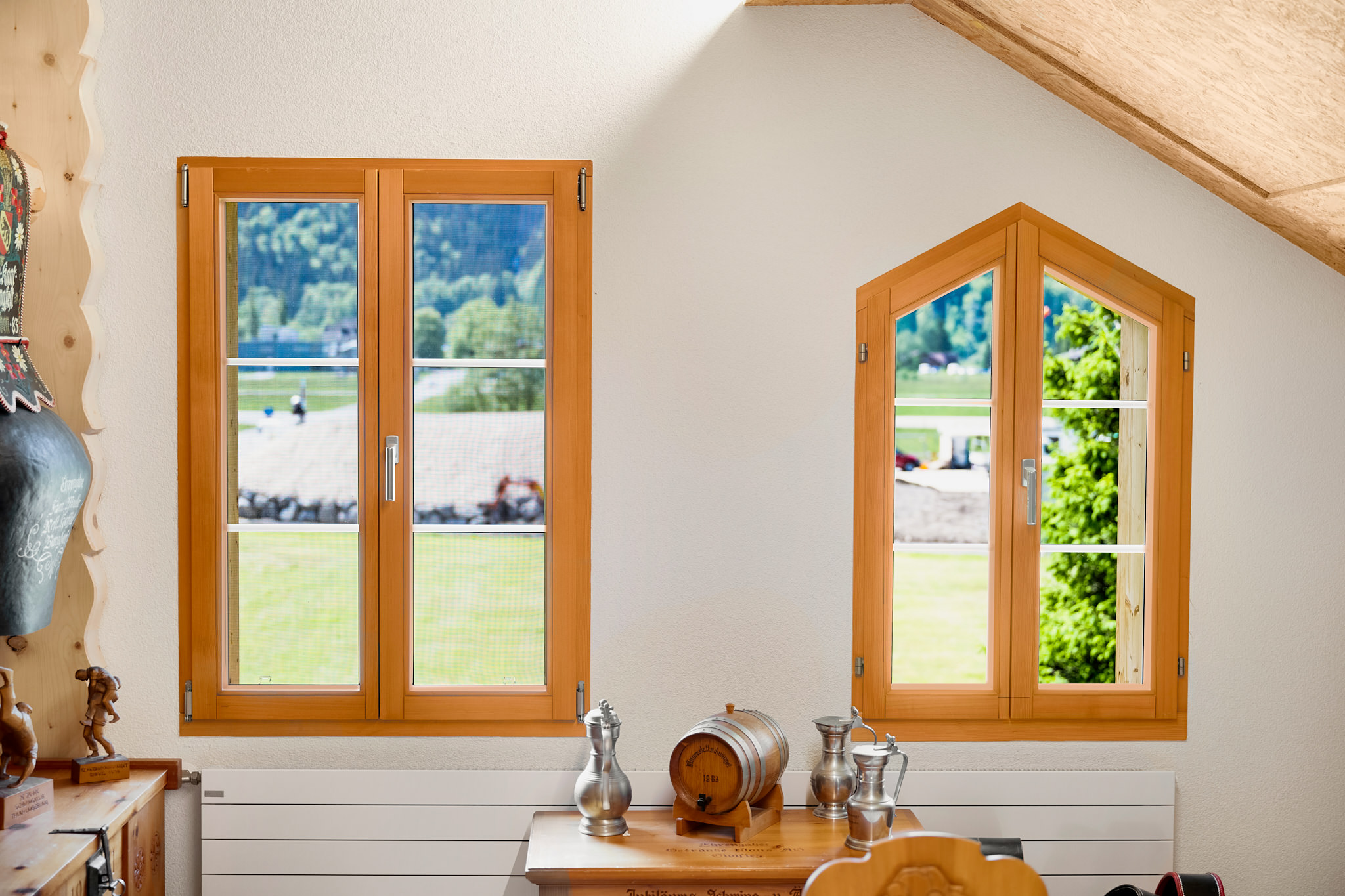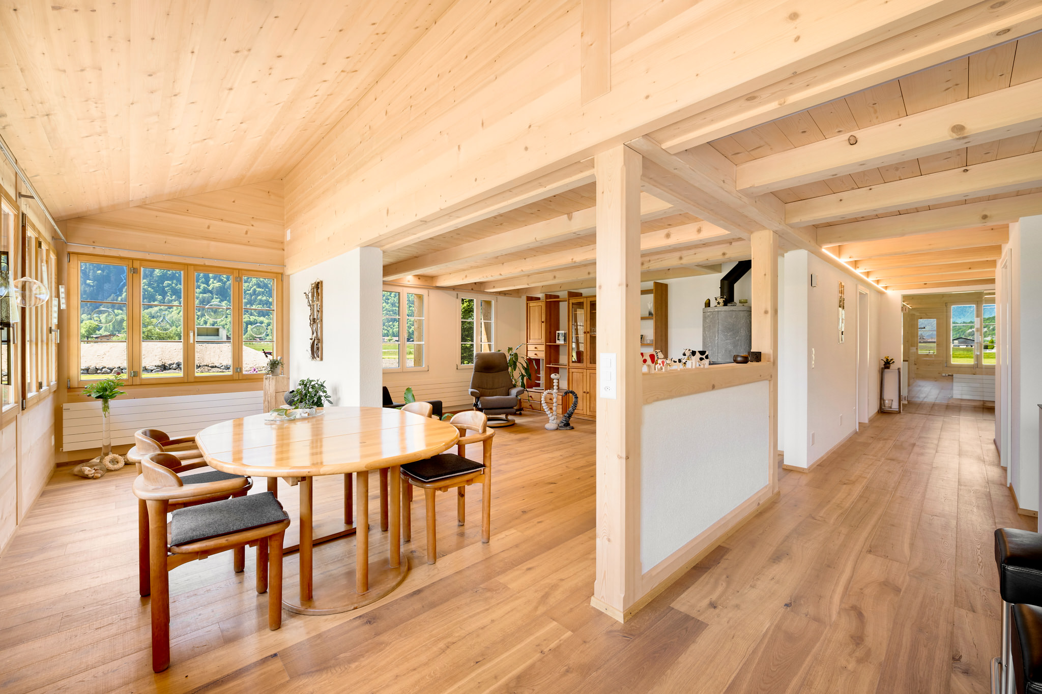 Dank der Planung und Projektleitung der Solarholzbauer entstand ein geräumiger, heller, moderner und doch traditioneller Wohnraum. Besonders beeindruckend: Die wirksame Wand- und Fensterisolation, welche die intensive Lärmbelastung, aufgrund der unweit startenden Düsenjets, um einige Dezibel zu verringern vermag.