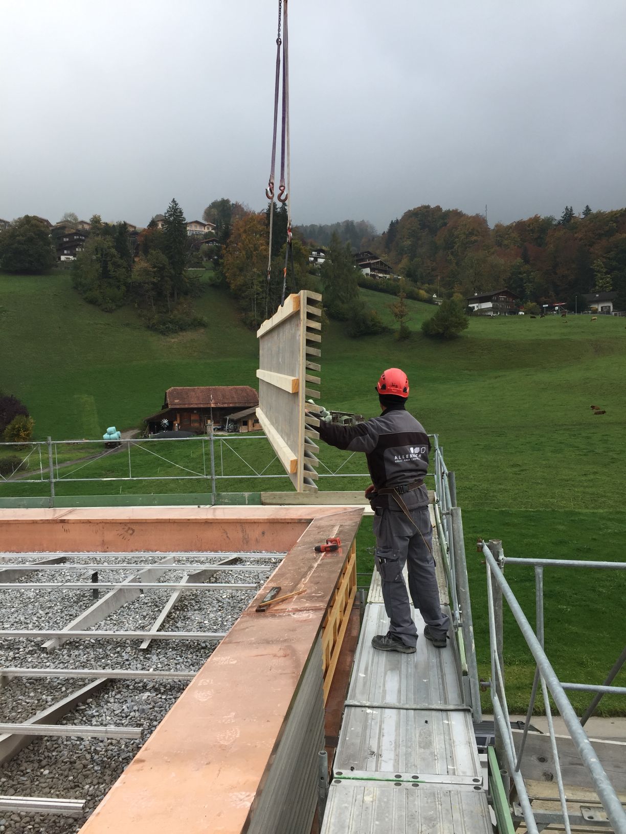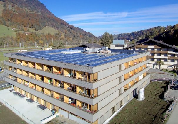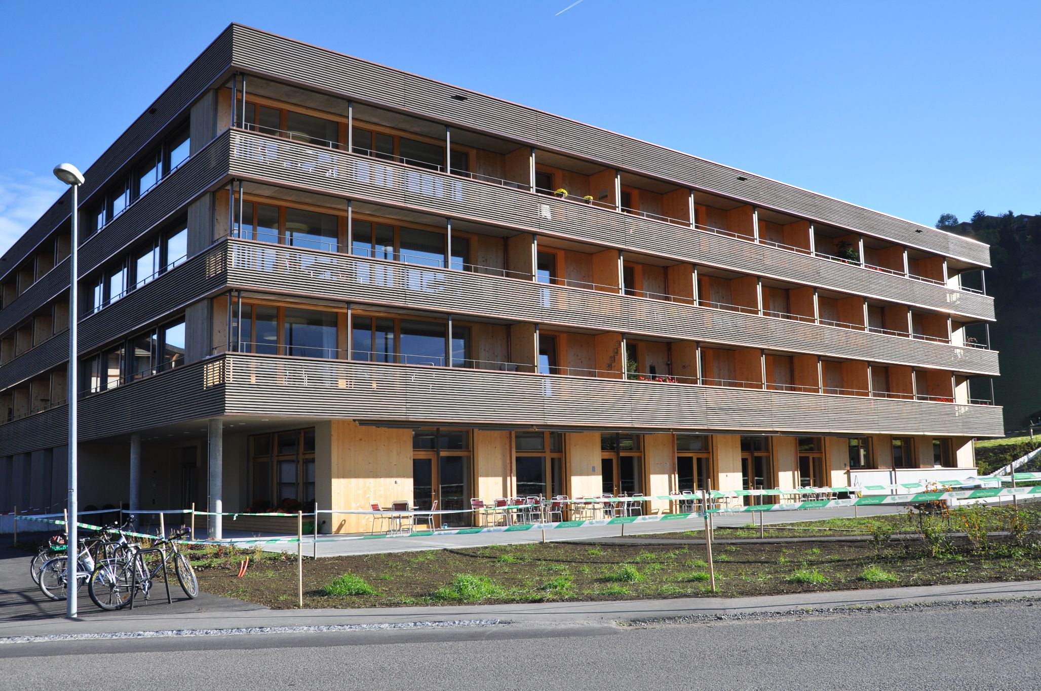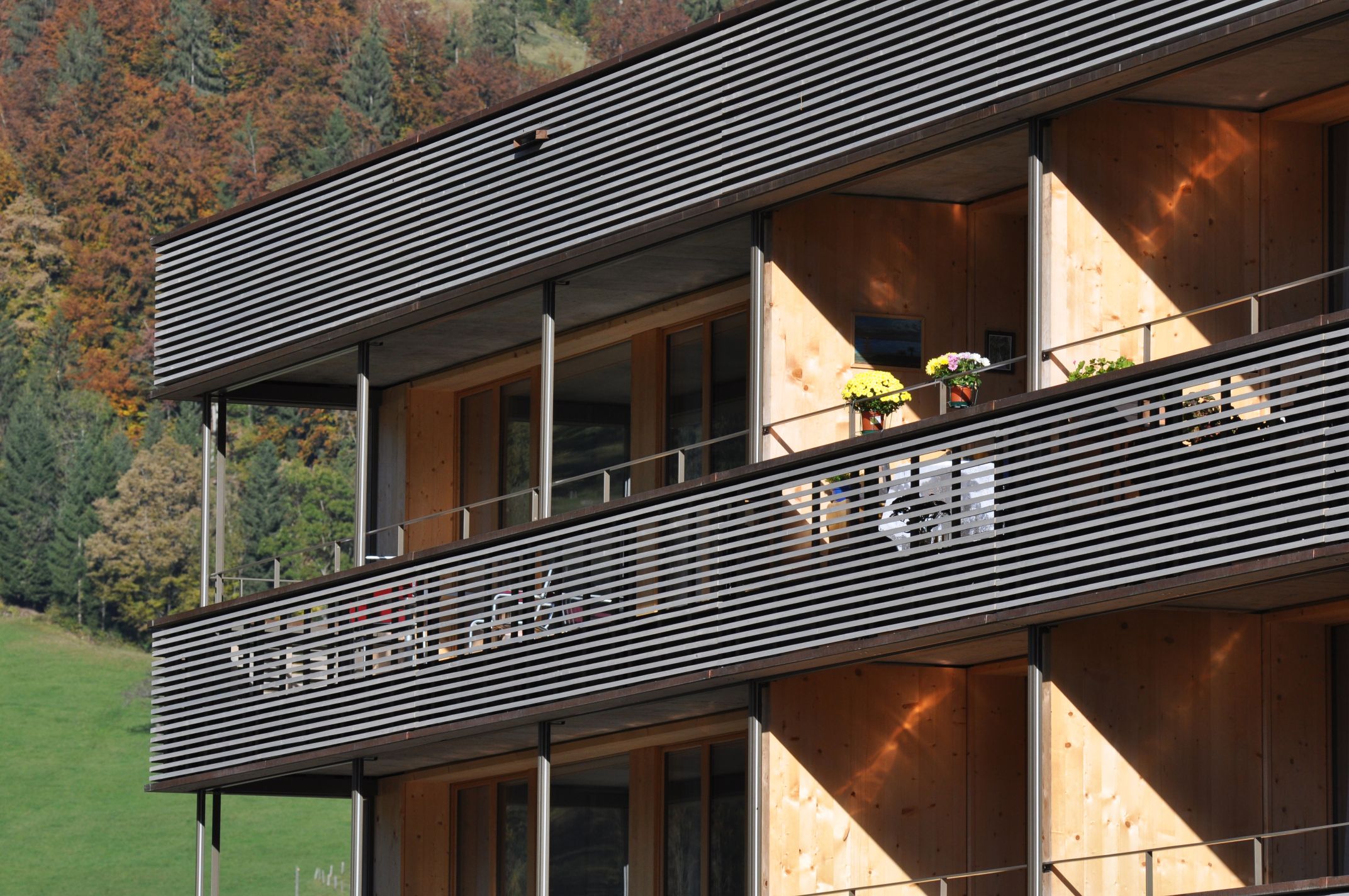 Neubau von Seniorenwohnungen in Reichenbach. Die massive Konstruktion aus Backstein und Beton wurde mit Dämmung und einer Holzverkleidung umhüllt. Die Holzverkleidung ist Lärche: ein unbehandelter und natürlicher Baustoff. Die unterschiedlichen Verwitterungs-Verfärbungen auf Nord- und Südseite wurden absichtlich in Kauf genommen, um dem Haus den unverwechselbaren Charakter zu verleihen.