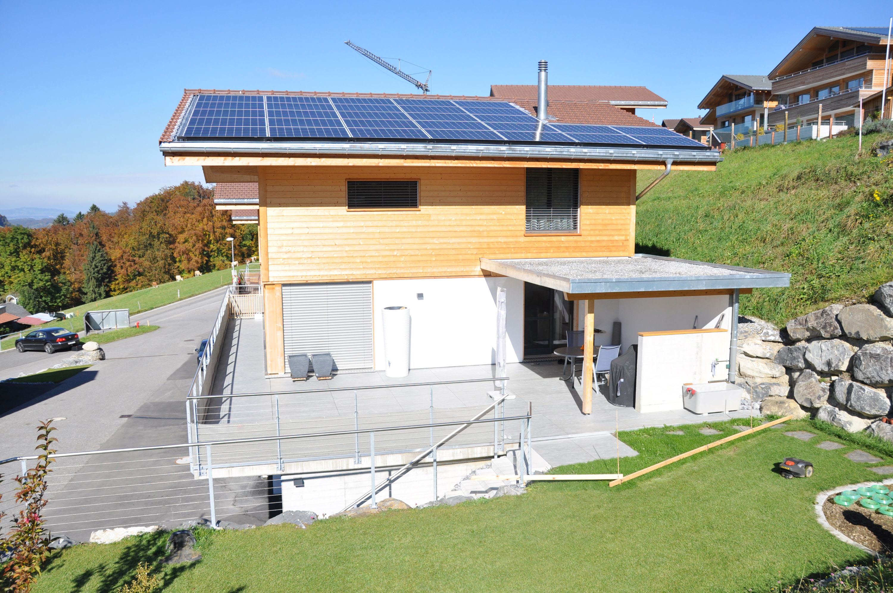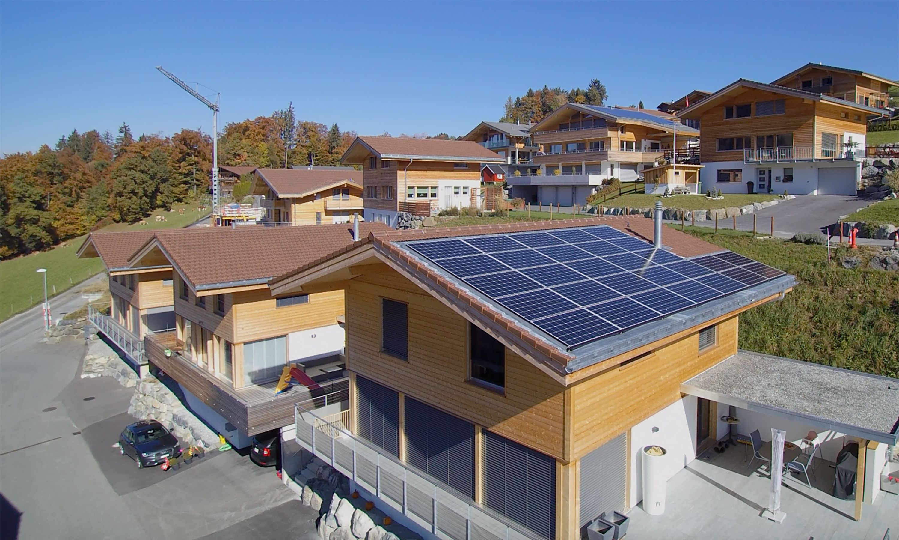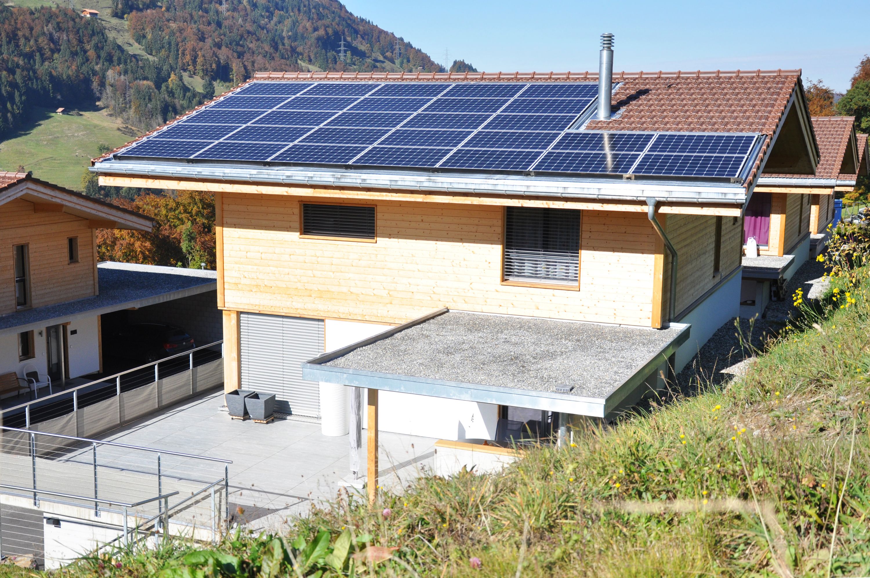 Das Einfamilienhaus der Familie Herrmann in der Gwanne wurde von den Solarholzbauern nach den Wünschen der Bauherrschaft erstellt. Nachträglich wünschte sich Familie Herrmann noch eine Solaranlage, die nach ca. 1.5 Jahren problemlos in das Hausdach integriert wurde. Somit entspricht das Haus dem allgemeinen Trend hin zu einem kleinen Hauskraftwerk, das mehr Energie herstellt als es selber verbraucht. So kann die Energiewende kommen!