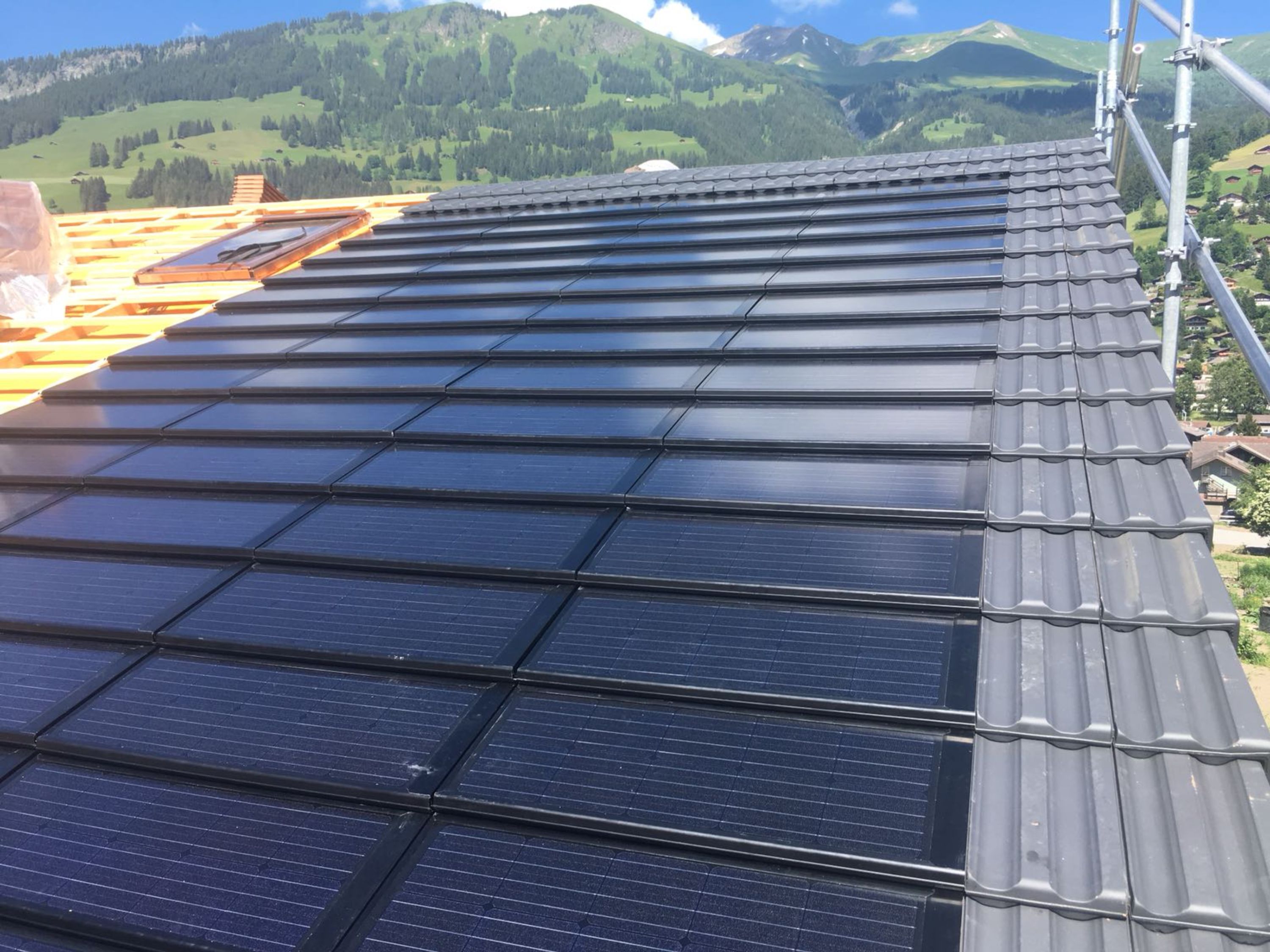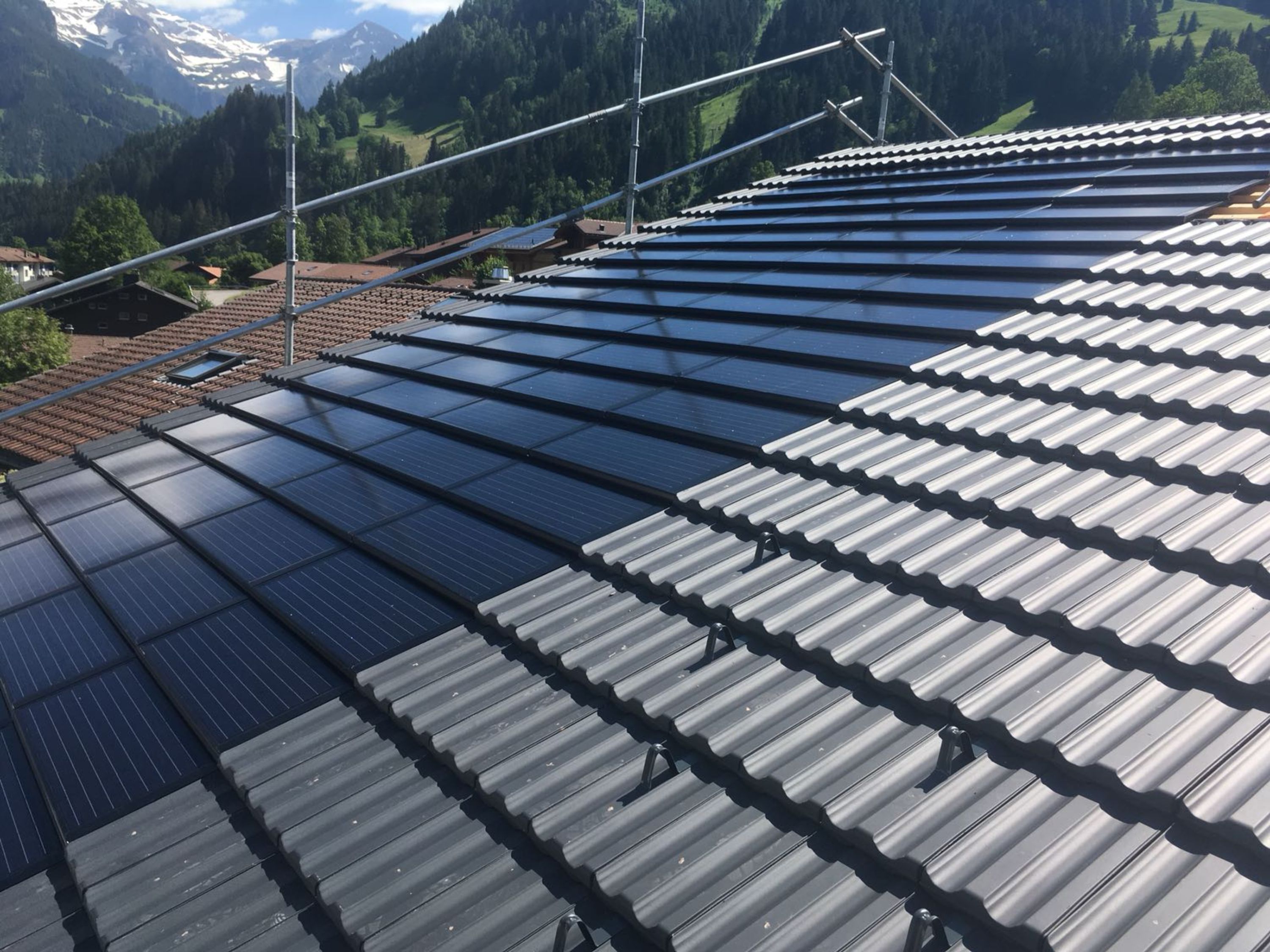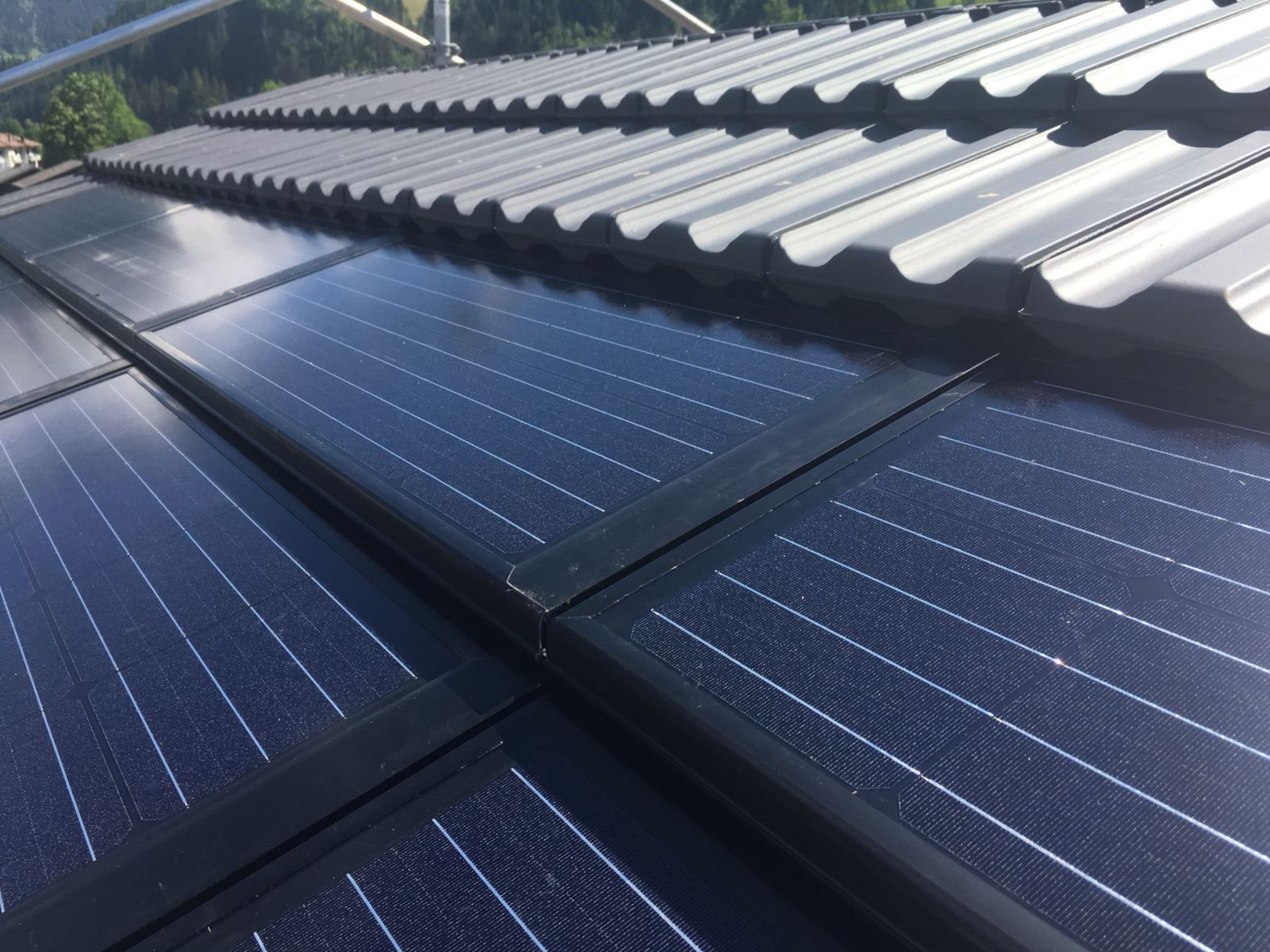Das Solar- System auf dem Chalet Firn in der Lenk ist ein absoluter Hingucker. Die sauber intergrierten Module, die sich nahtlos an die Ziegel anschliessen, machen das Dach zum Kraftwerk, ohne den Charakter zu ändern. Eine Photovoltaik-Anlage der Spitzenklasse.