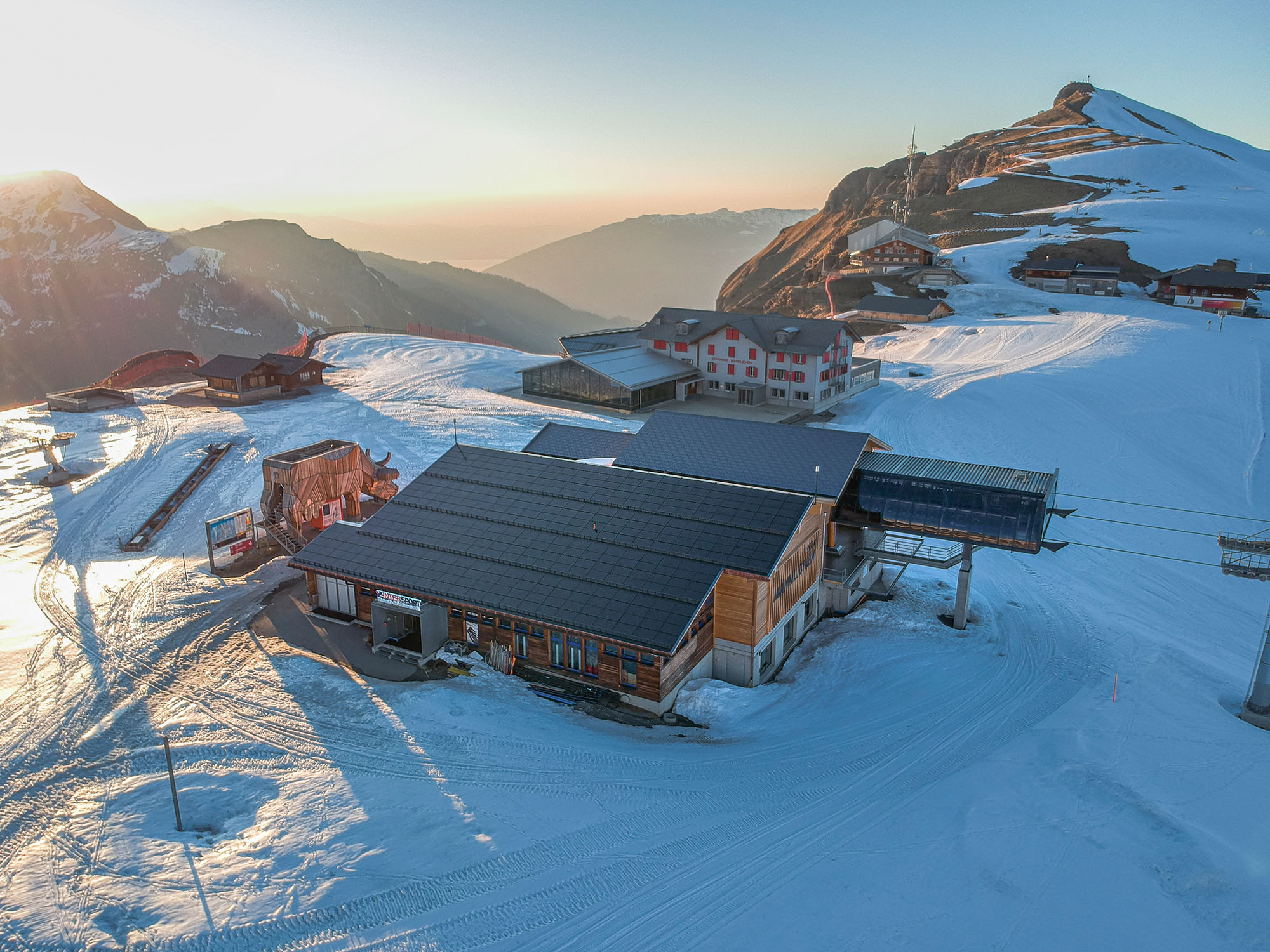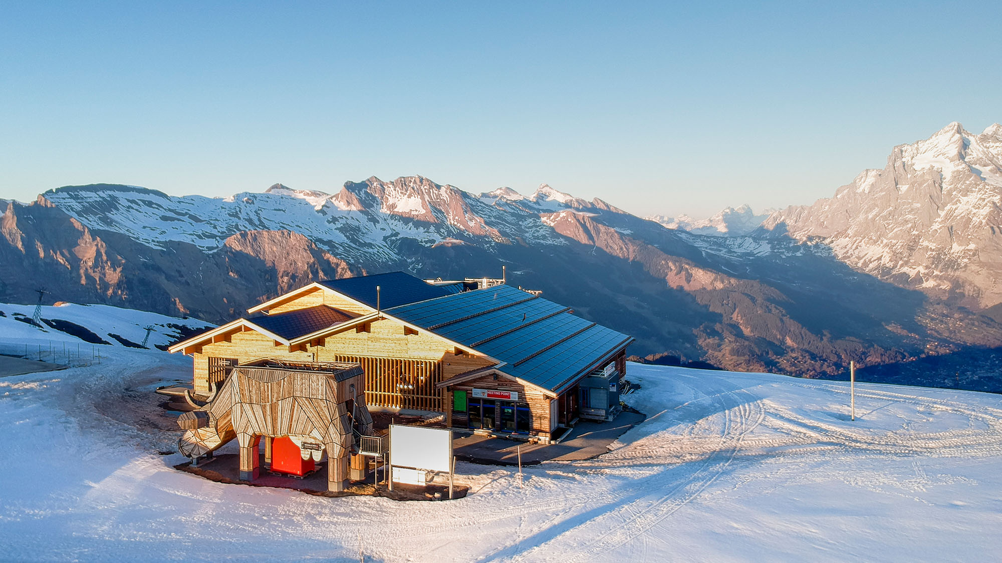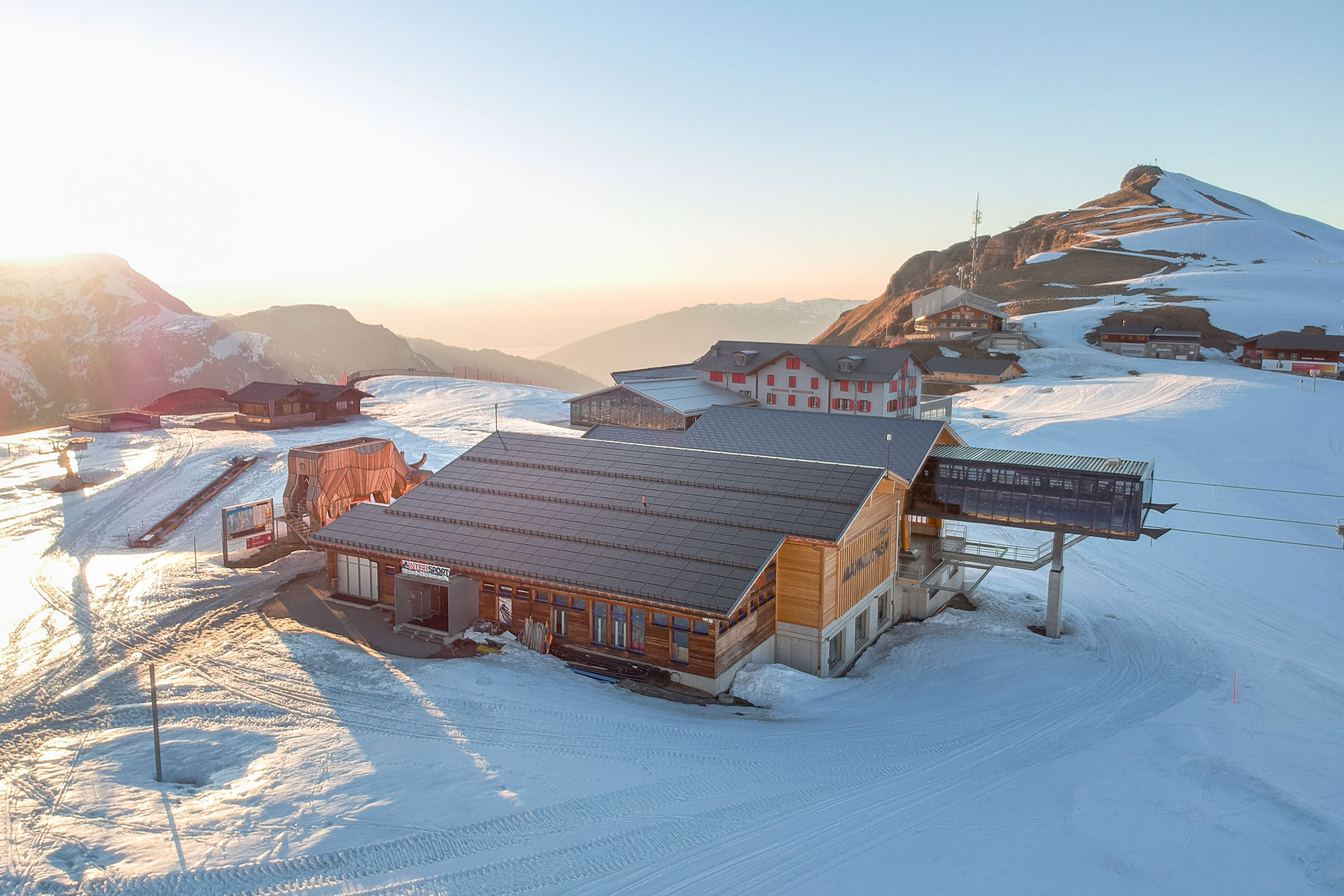 Auf über zweitausend Meter über dem Meer, wo das Dreigestein Eiger, Mönch und Jungfrau eine majestätische Kulisse bildet, steht das neue und stilvolle Gebäude der Bergstation Männlichen. Die Südseite des Daches wurde mit einer «3S MegaSlate» Solaranlage vom Typ «Alpin» belegt – eine der wenigen Solaranlagen, die im alpinen Gebiet eingesetzt werden können. Schnee- und Windlasten sind für diese Anlage kein Problem. Gemeinsam mit der soliden Fassadenkonstruktion bildet die Photovoltaikanlage eine dauerhafte und hochwertige Gebäudehülle, welche den aussergewöhnlichen Anforderungen der alpinen Bergregion jederzeit und anhaltend standhält.