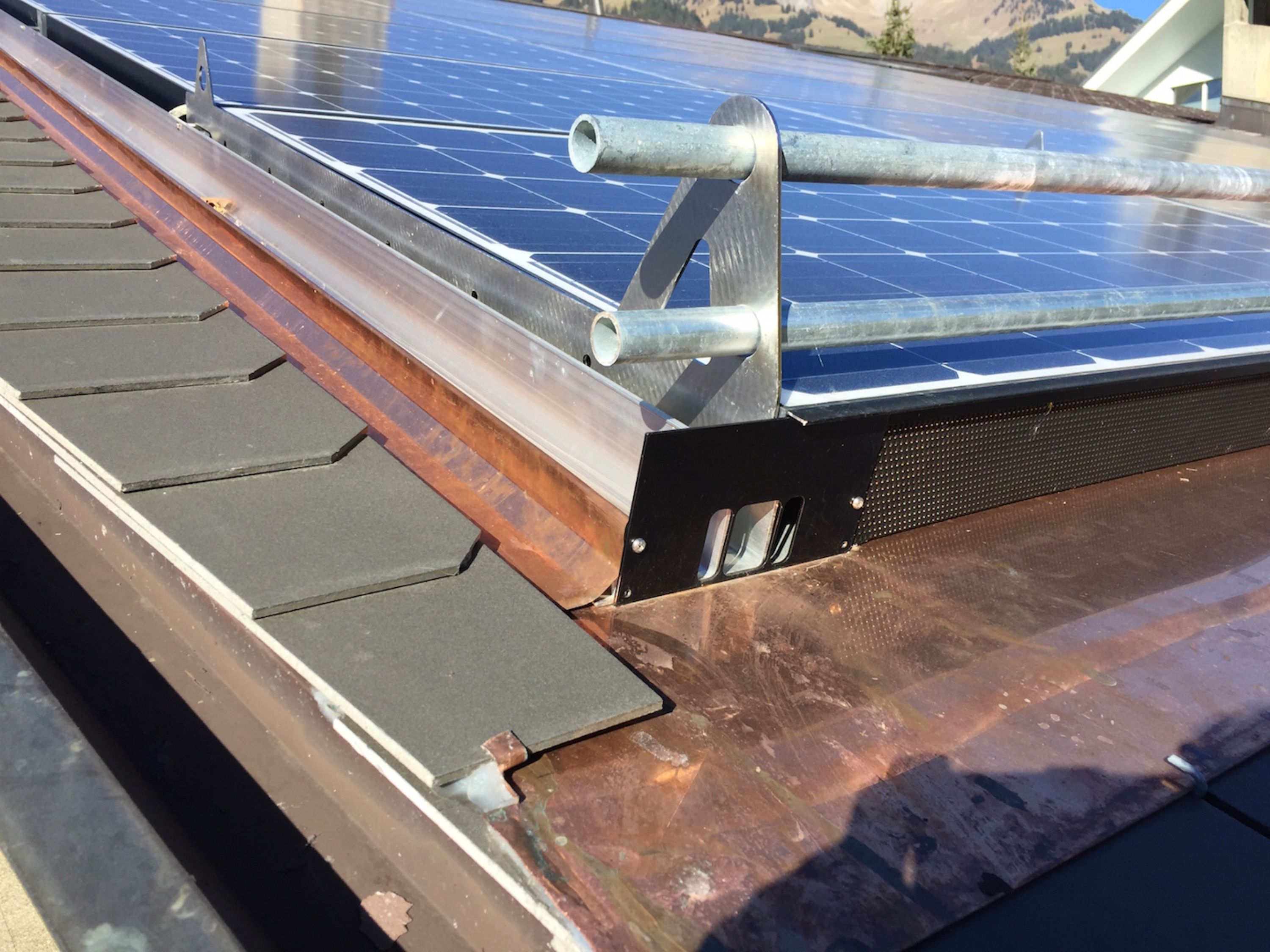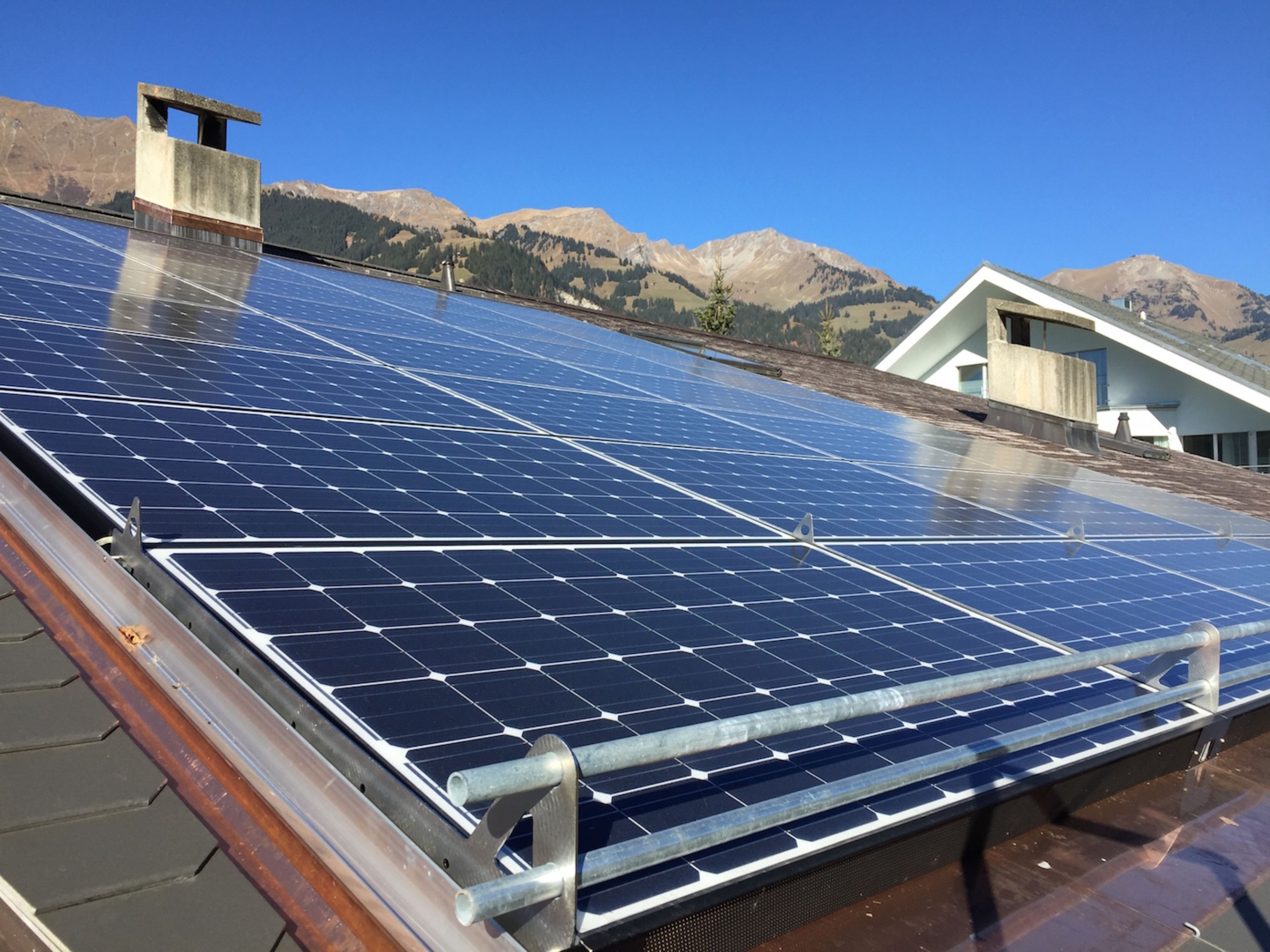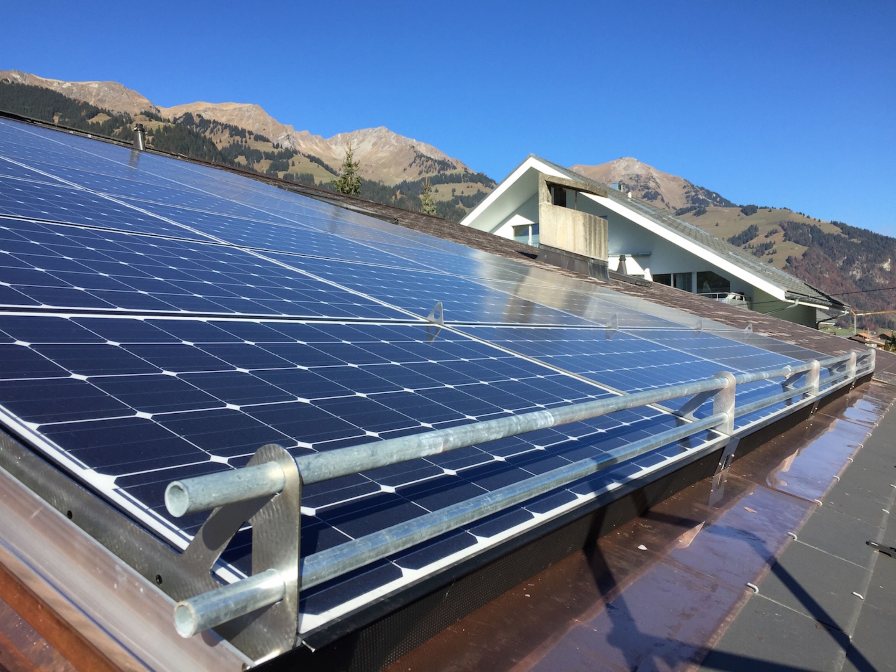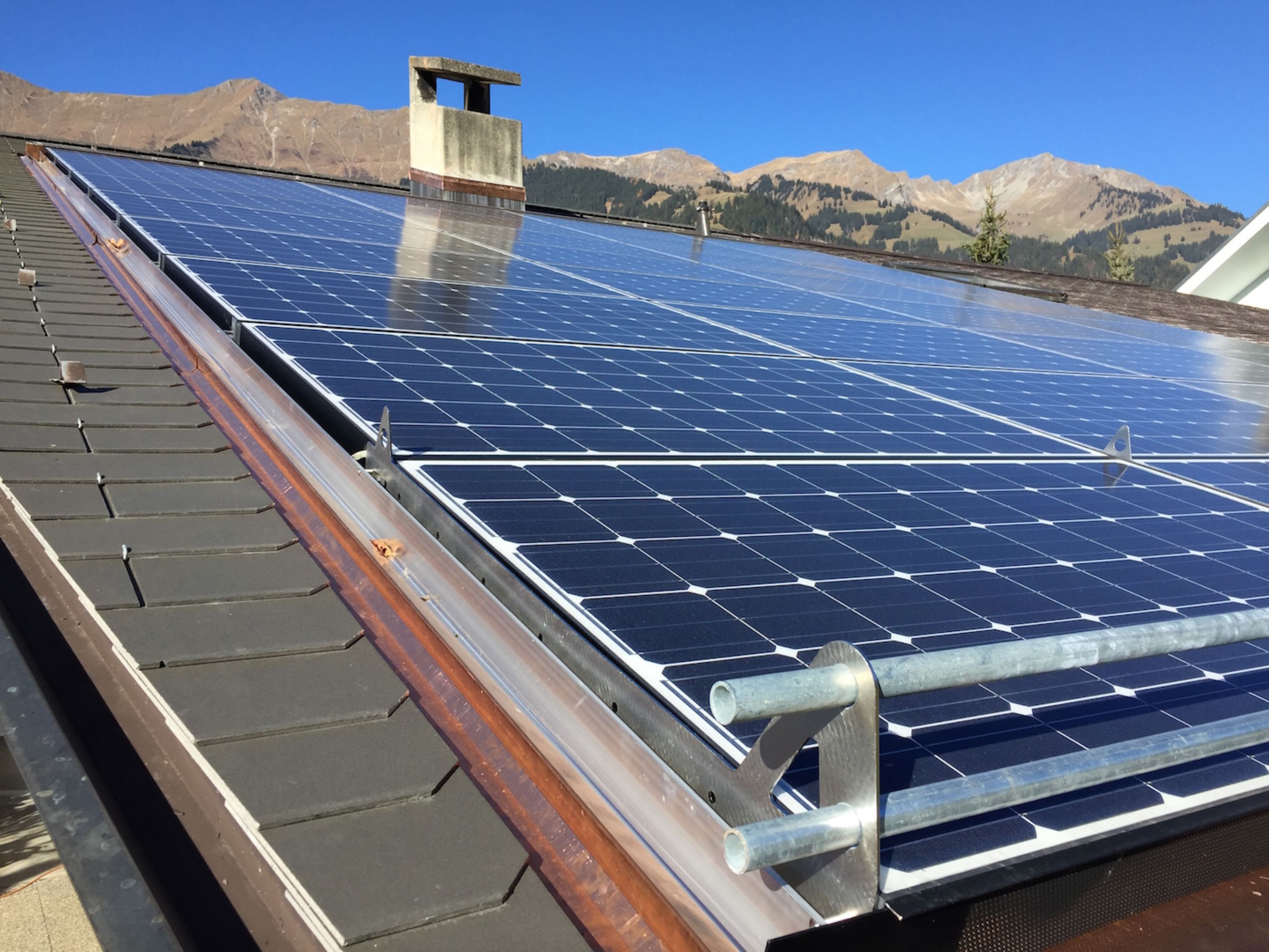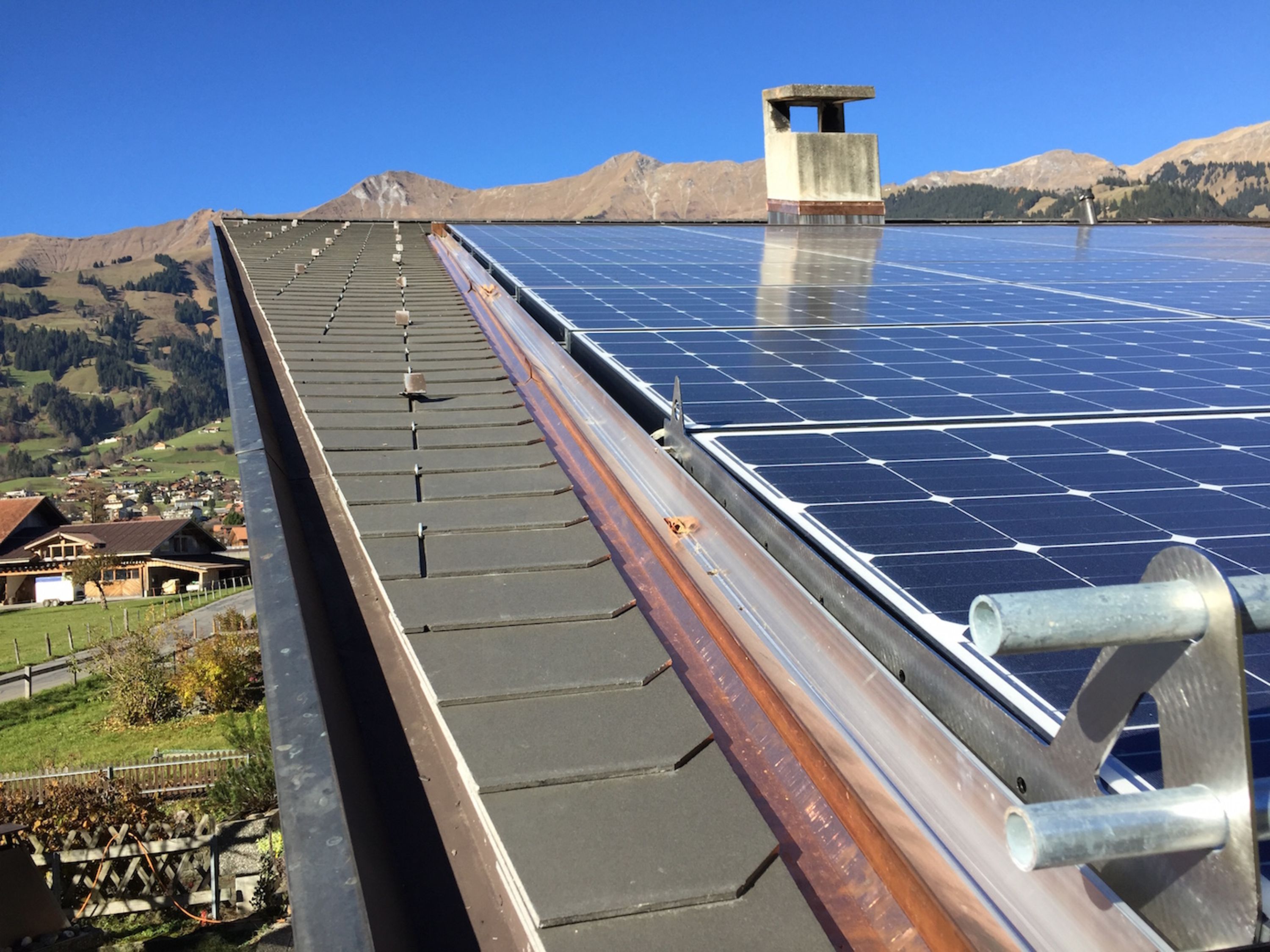 Der Neubau einer Photovoltaik-Anlage auf ein erneuerungsbedürftges Eternitdach. Erst wurde die bestehende Eterniteindeckung demontiert. Statt dessen wurde eine Indachanlage montiert. Rund um die Anlage wurde neuer Eternit verlegt um das Erscheinungsbild des Daches nicht zu verändern. Mit der Montage eines Schneefangs und Anschlagpunkten für Wartungs- und Reinigungsarbeiten wurden auch die geltenden Sicherheitsnormen eingehalen.