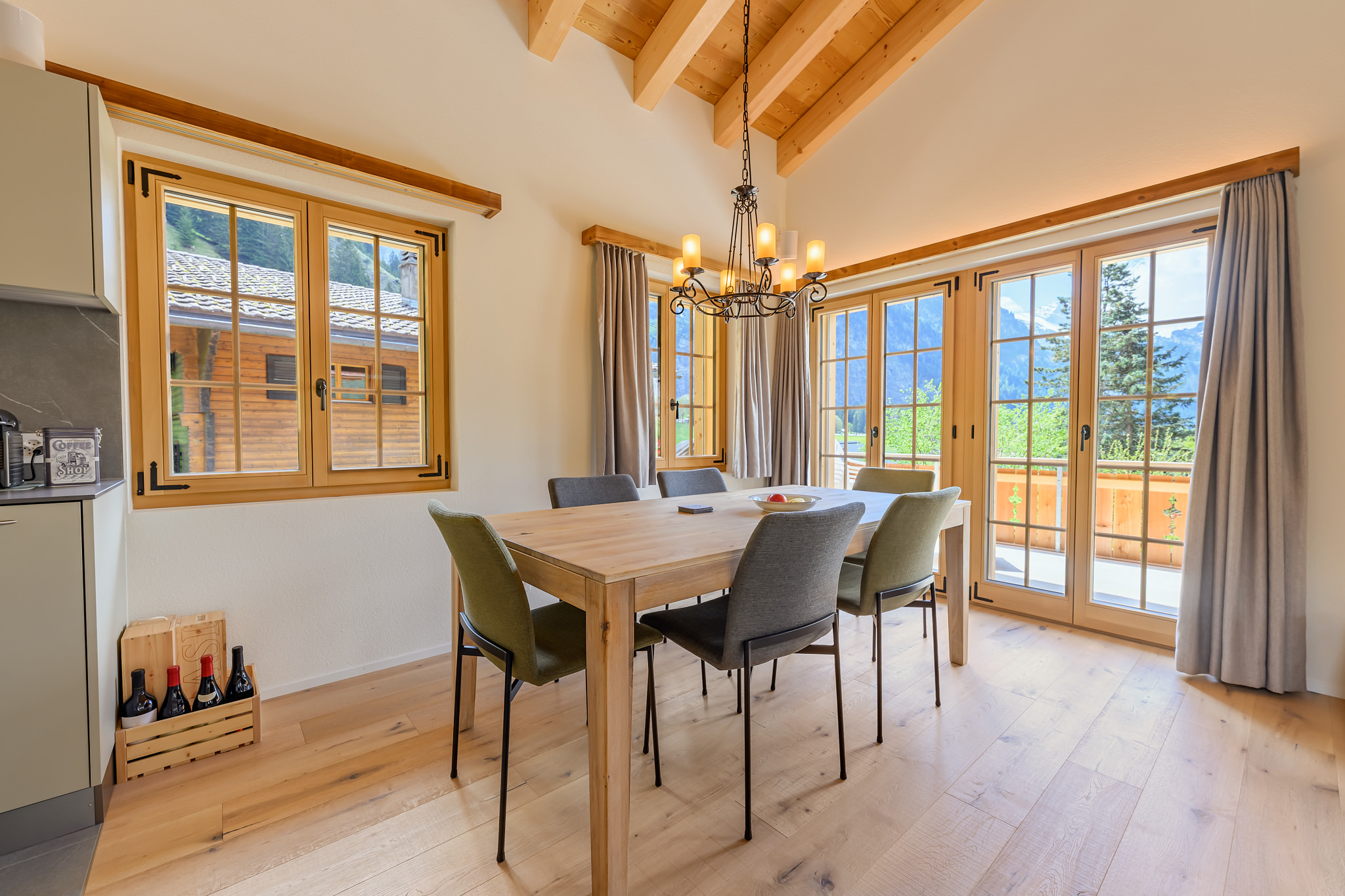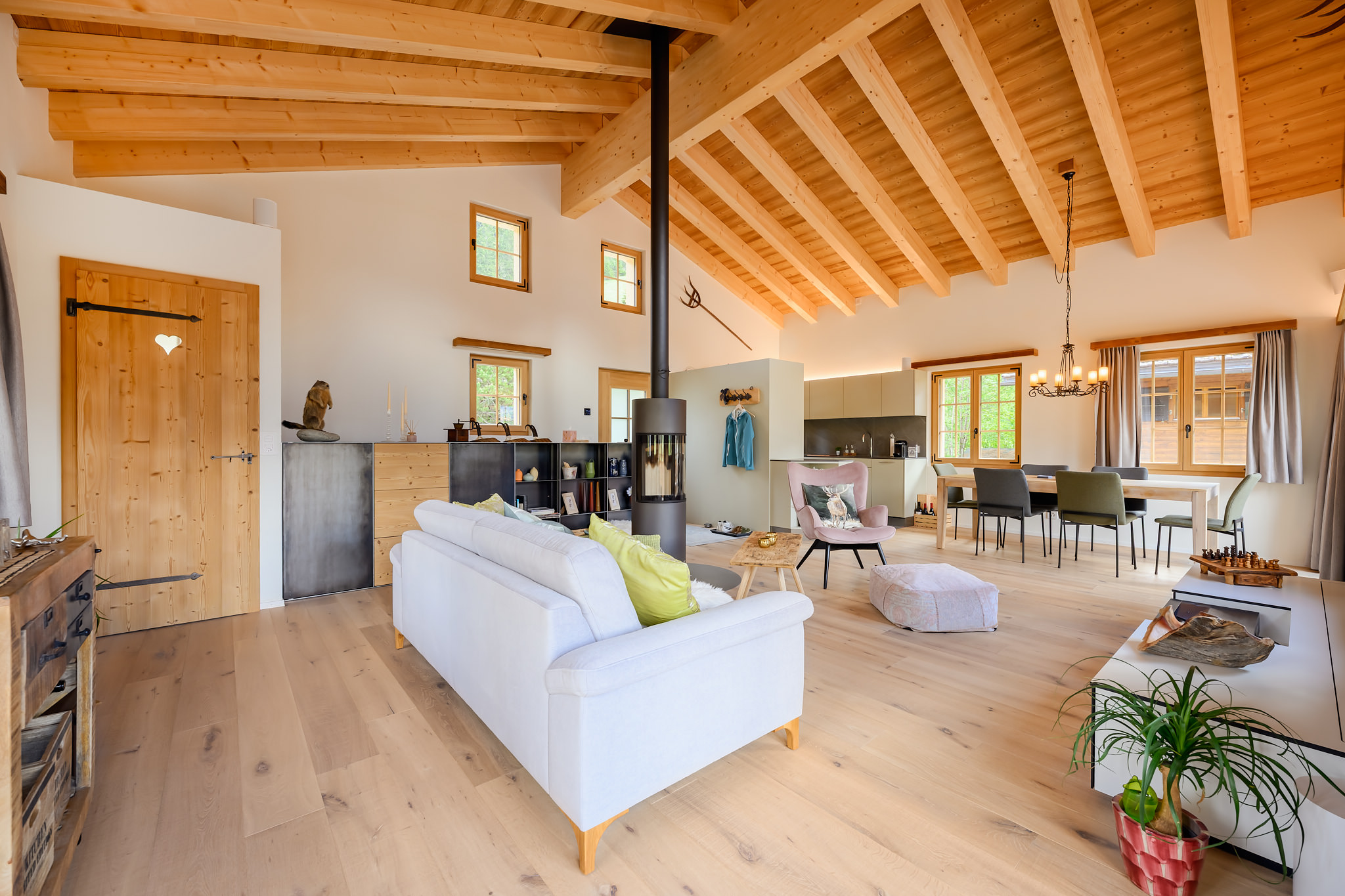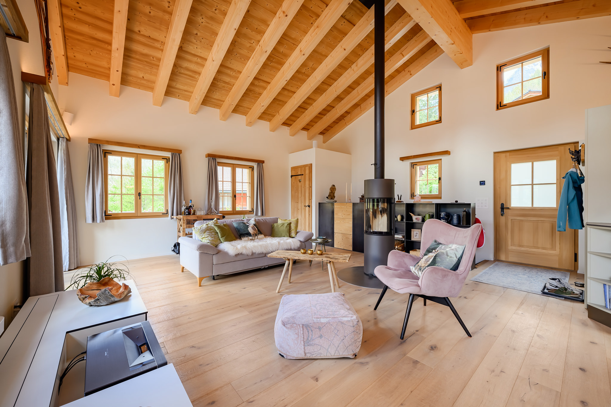 Die Highlights des Neubaus sind die traditionellen Fassadenelemente, der fein verarbeitete Sichtdachstuhl und die durchdachte Raumaufteilung mit viel Holz, Licht und Blick in die Berge. Der Innenausbau verbindet Moderne mit Klassik – etwa bei der Auswahl der Materialien oder kleinen Details, wie den geschnitzten Eckverzierungen oder Fensterläden in typischer Chalet-Optik. So entstand ein stimmiges Ganzes, das Alt mit Neu gekonnt verbindet.