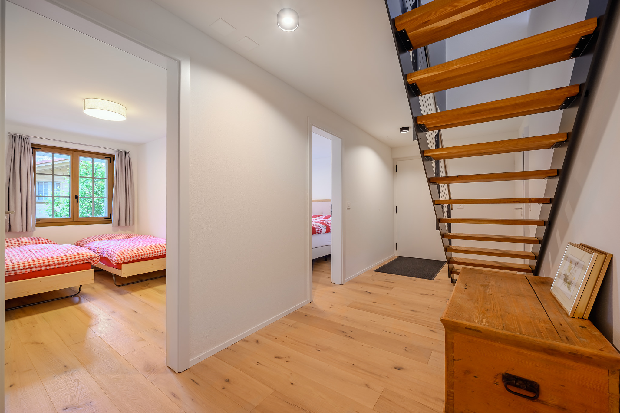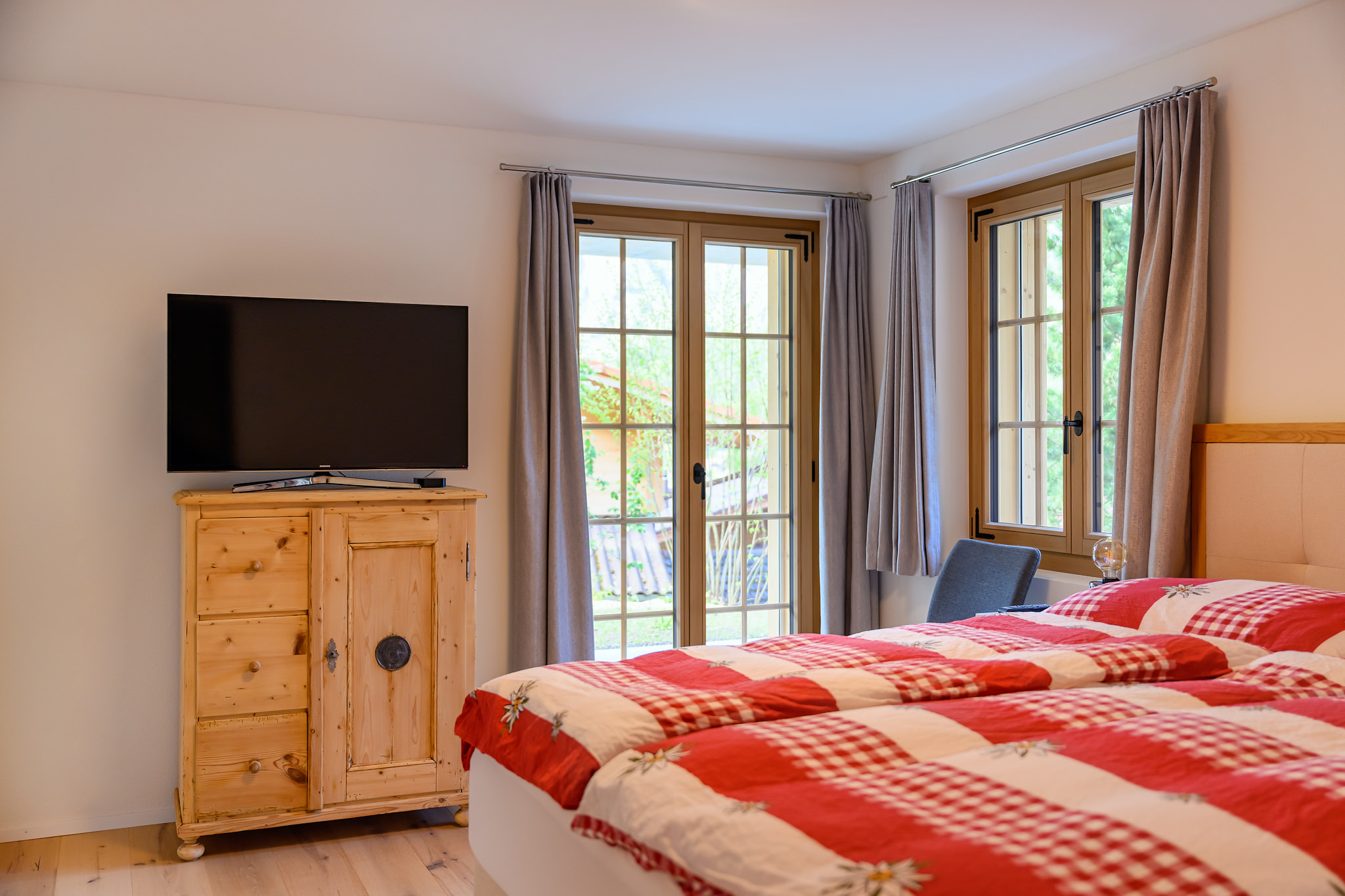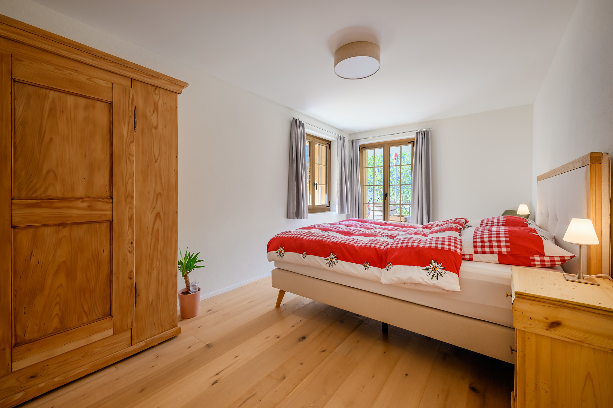 Die Highlights des Neubaus sind die traditionellen Fassadenelemente, der fein verarbeitete Sichtdachstuhl und die durchdachte Raumaufteilung mit viel Holz, Licht und Blick in die Berge. Der Innenausbau verbindet Moderne mit Klassik – etwa bei der Auswahl der Materialien oder kleinen Details, wie den geschnitzten Eckverzierungen oder Fensterläden in typischer Chalet-Optik. So entstand ein stimmiges Ganzes, das Alt mit Neu gekonnt verbindet.