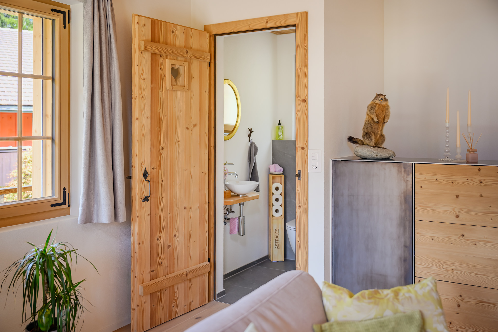 «Uns war es wichtig, dass der Neubau die Seele des alten Chalets weiterträgt. In Zusammenarbeit mit den Solarholzbauern haben wir viel Wert auf historisch stimmige Elemente gelegt. So wurde beispielsweise die Tür zum Gäste-WC nach einem klassischen Vorbild aus Grossmutters Zeiten nachgebaut – ein kleines, aber feines Detail.