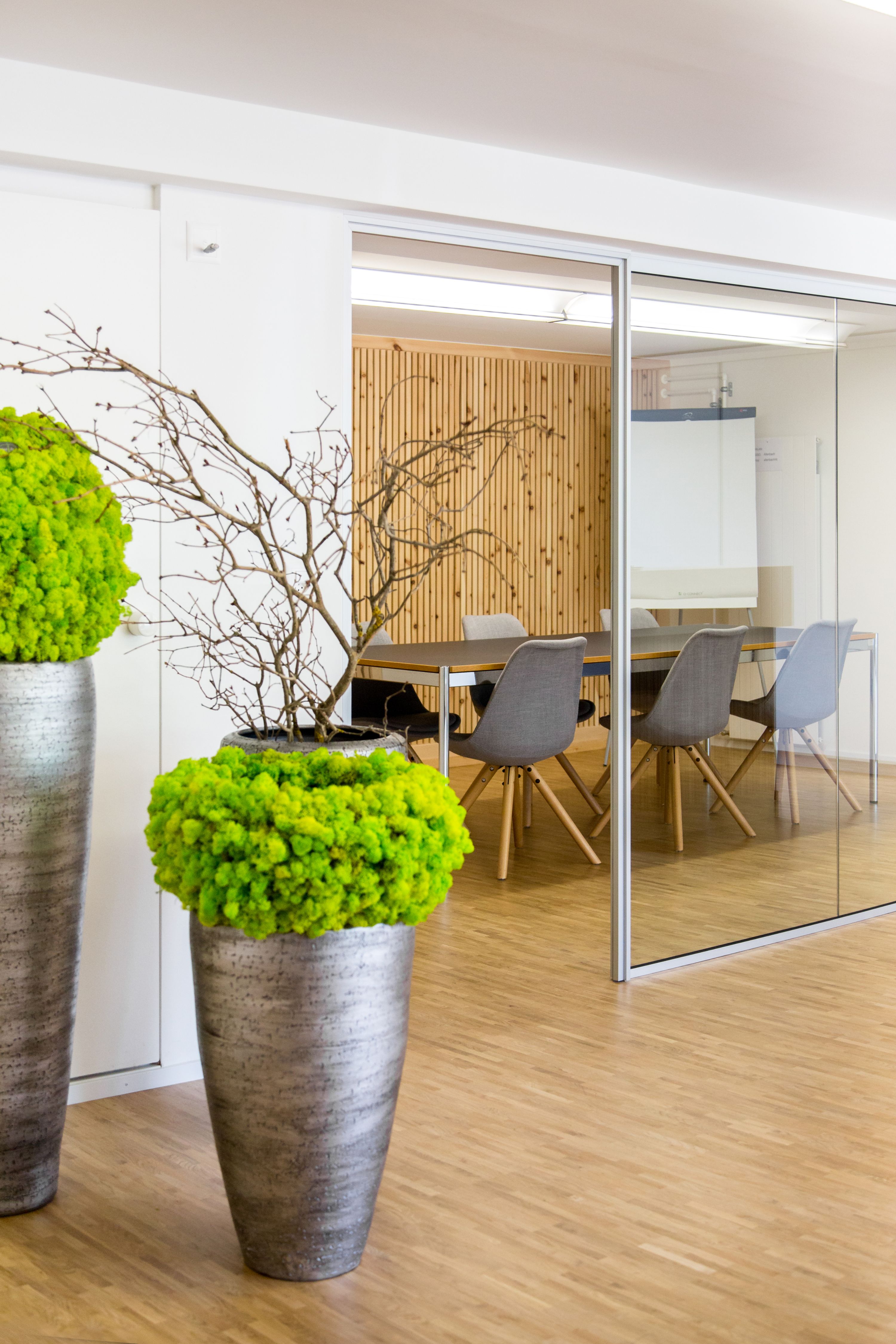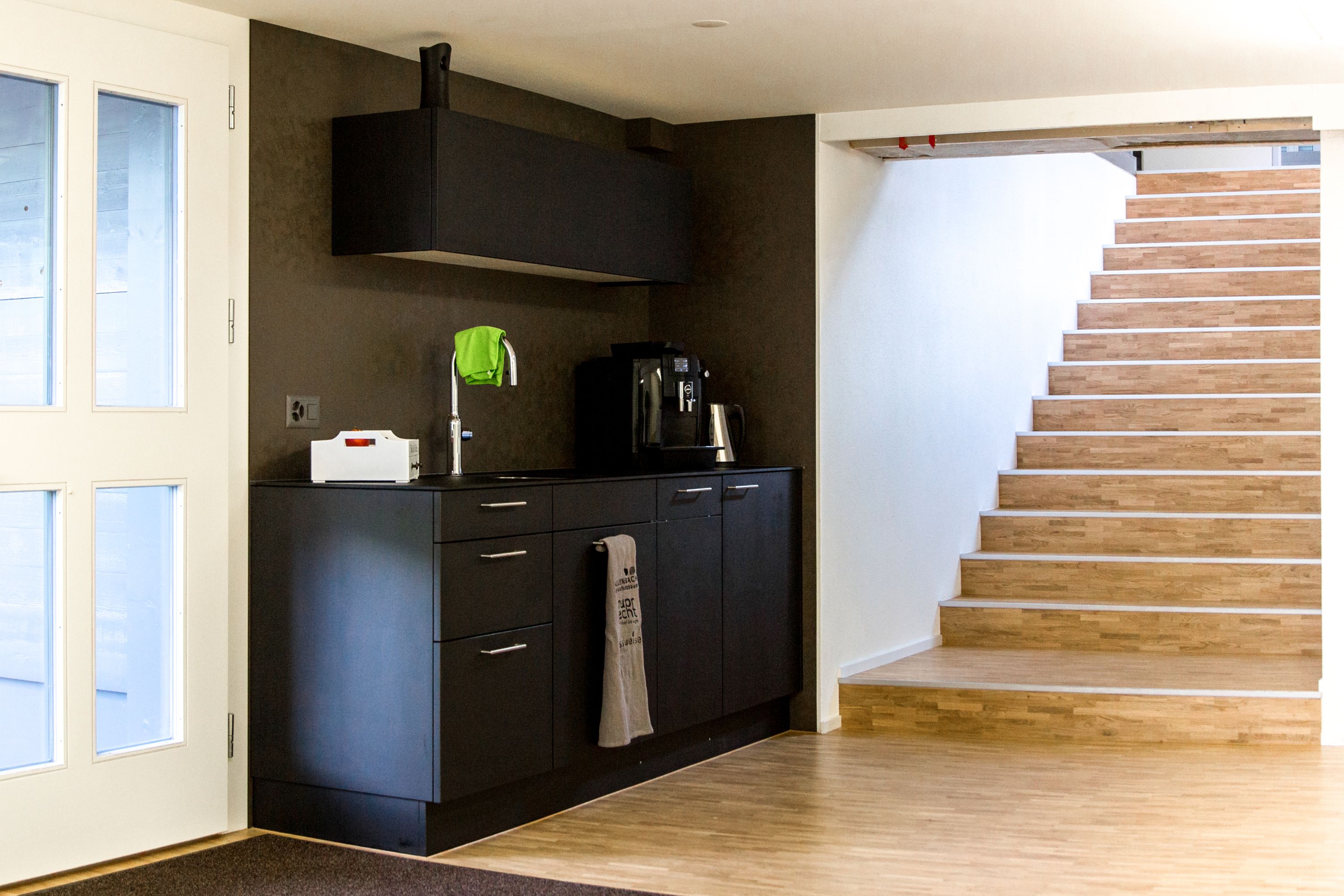 Umbau der bestehenden Büroräumlicheiten im UG mit einem grosszügigen Sitzungszimmer und einem Backoffice im Eingangsbereich. Die kleine Teeküche sowie der Aufgang in die Produktionsräume runden das Ganze ab.