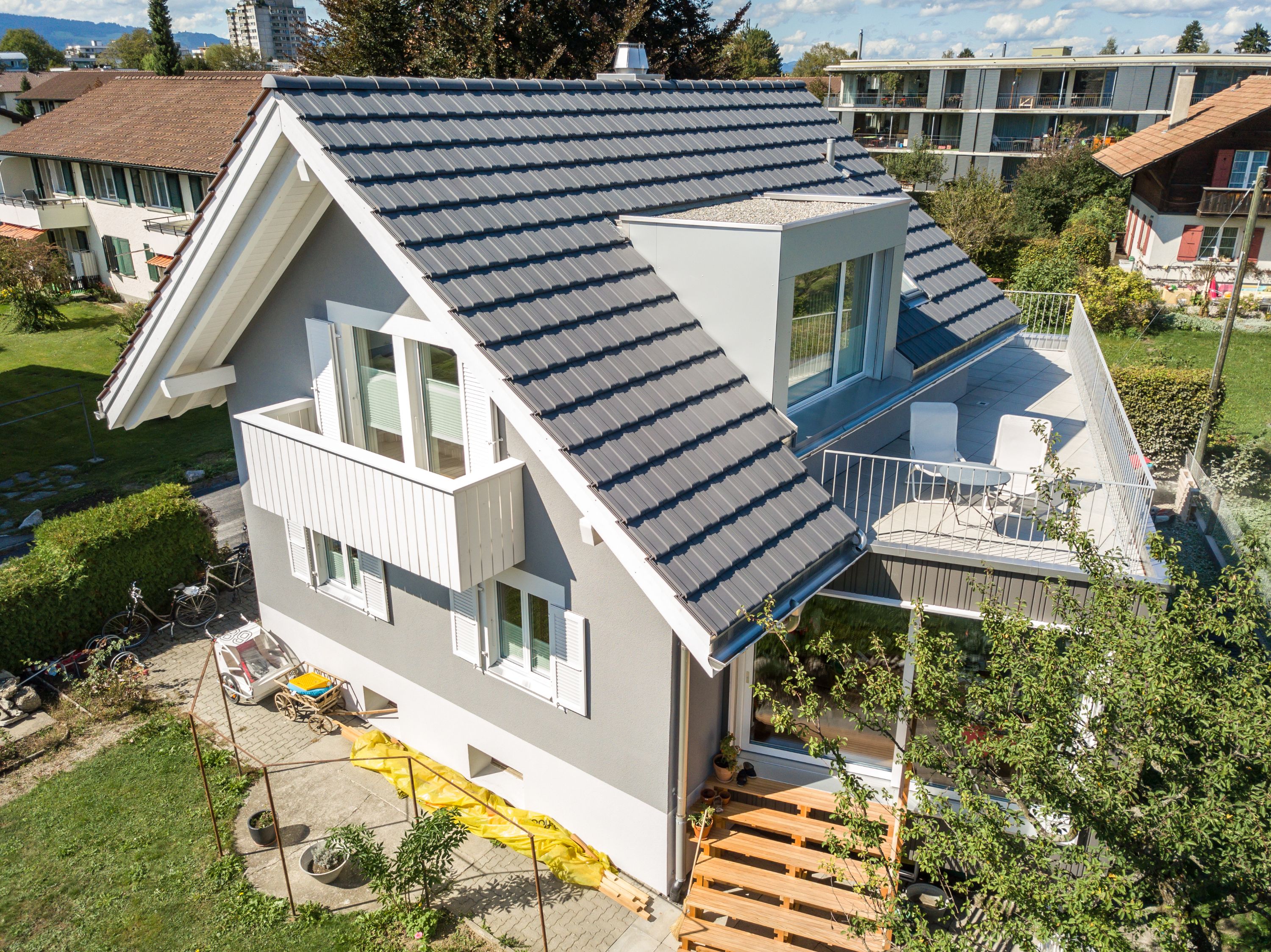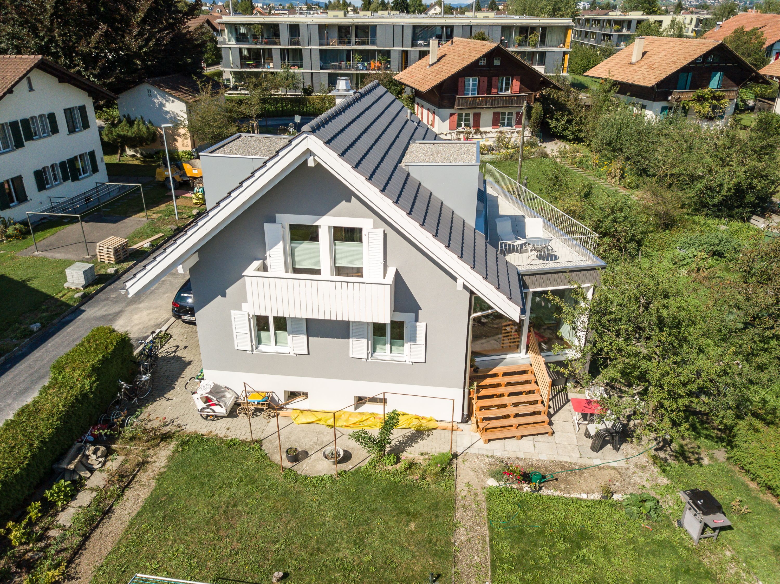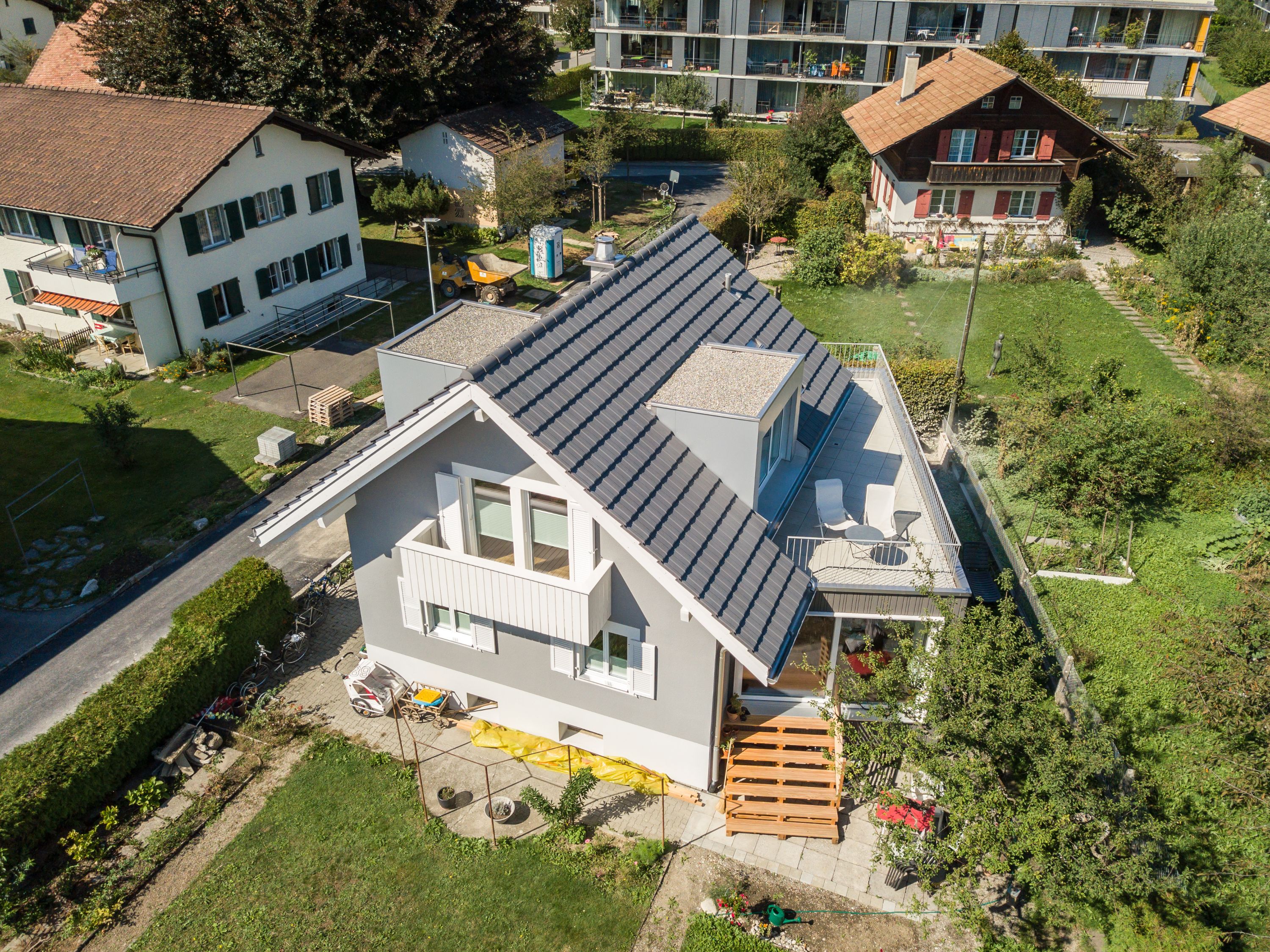 Der Umbau des bestehenden Einfamilienhaus aus der ersten Hälfte des 20. Jahrhunderts war eine Herausforderung. Der neue Anbau wurde gekonnt in die bestehende Struktur eingebaut und harmoniert sehr gut mit der alten Bausubstanz. Das Dach wurde von Grund auf erneuert und hat, trotz gleicher Abmessung und Grösse, deutlich an Wohnkomfort und Helligkeit gewonnen. Die Terrasse auf dem Anbau ist ein Bijou und für das Geniessen der Natur unabdingbar. Fazit: Rundum gelungen.