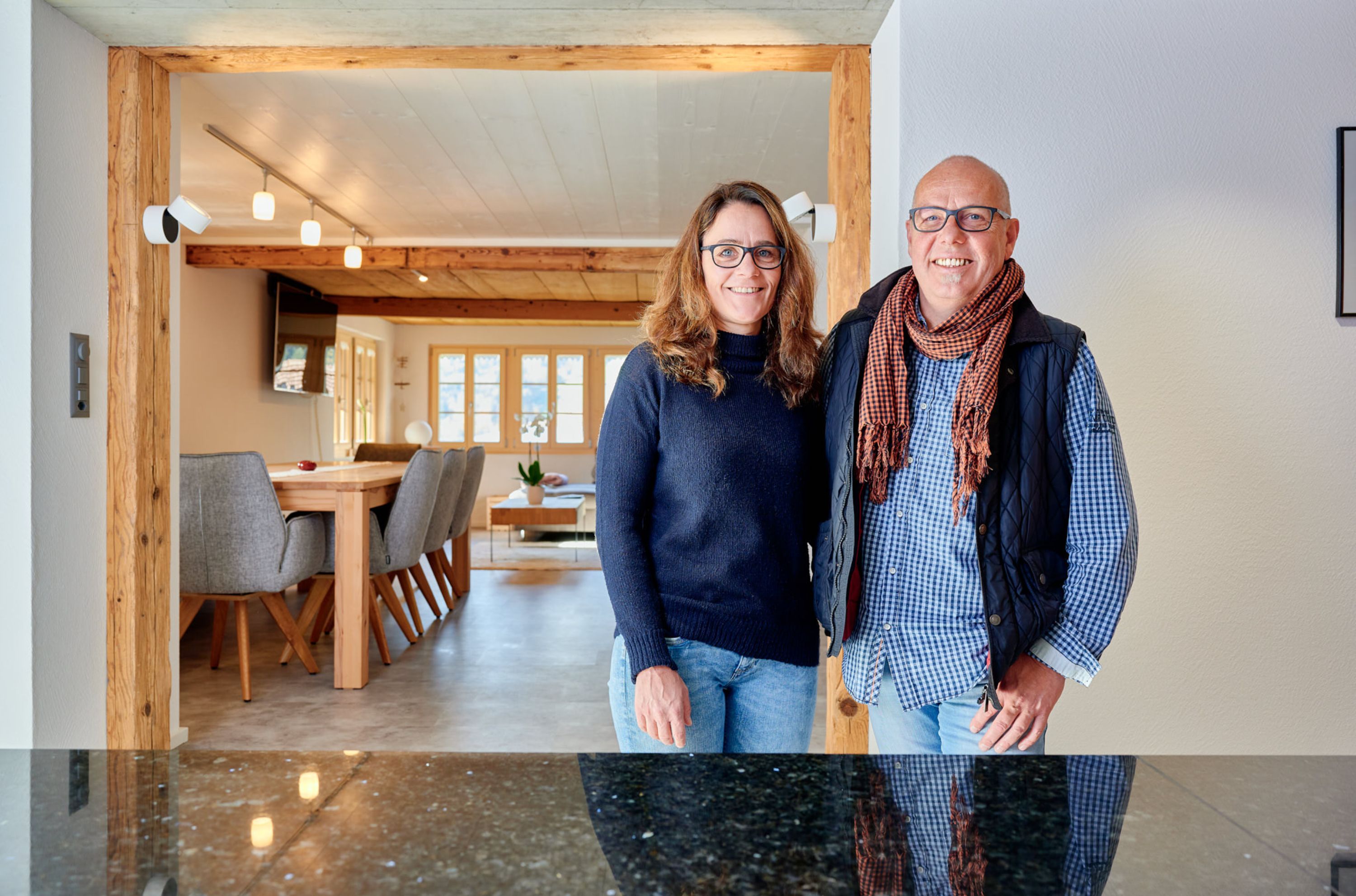 «Nachdem wir vor Jahren eher negative Erfahrungen gemacht hatten, starteten wir mit gemischten Gefühlen in den Umbau. Die Solarholzbauer konnten diese aber schon nach kurzer Zeit korrigieren: Die Zusammenarbeit war überaus angenehm! Alle Mitarbeiter waren stets speditiv, schnell und zuvorkommend. Besonders schön war das harmonische Zusammenspiel zwischen helfenden Familienmitgliedern und dem Allenbach-Team; das liess die Bauzeit wie im Flug vergehen.» Bernhard & Monika Isler