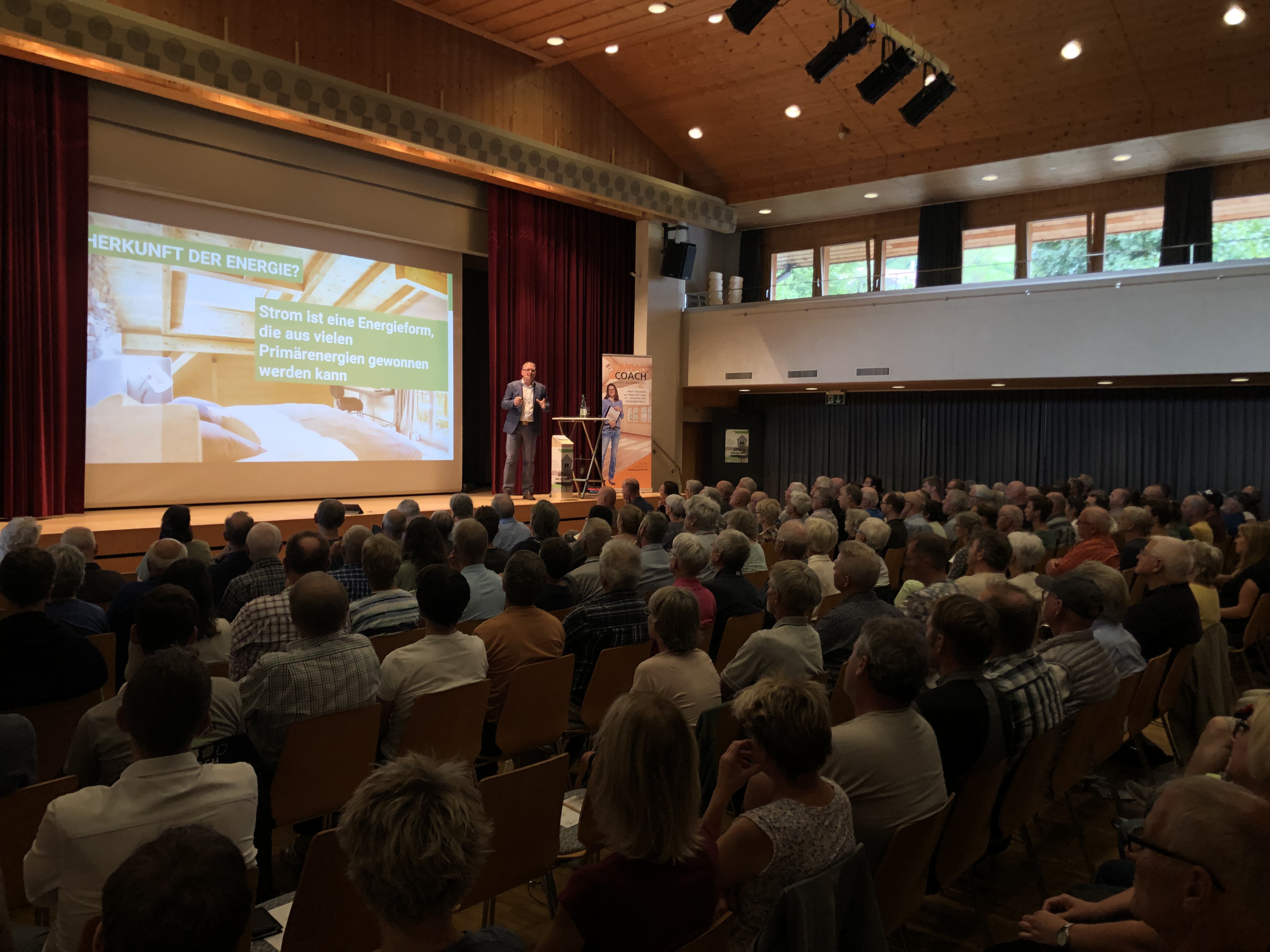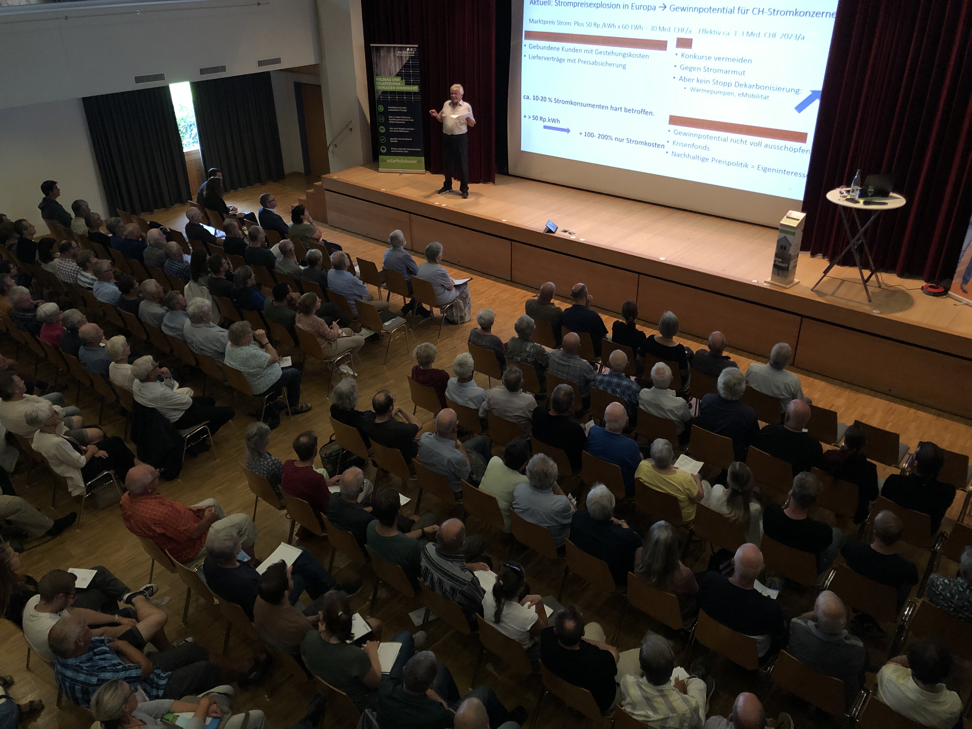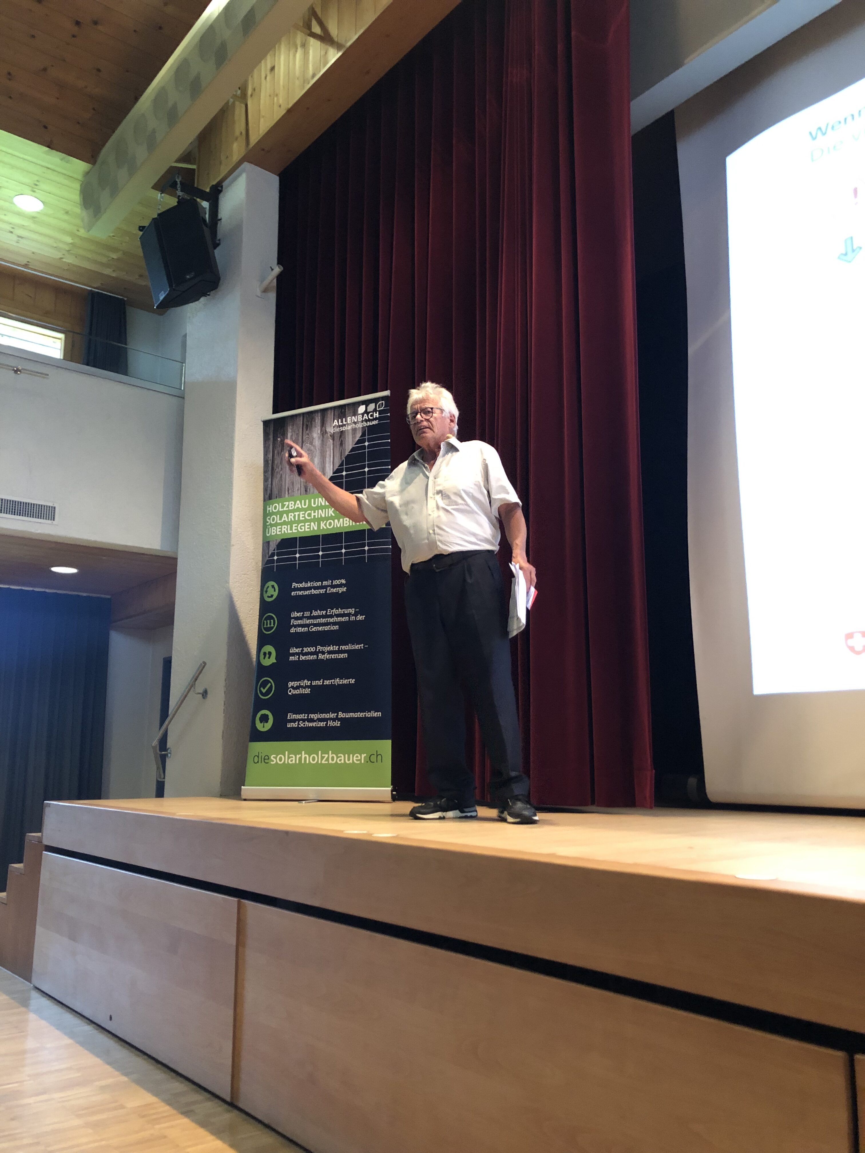 Die Referenten am Anlass waren Ruedi Meier, Ökonom, Raumplaner und Energiespezialist, sowie Marc Allenbach, Unternehmer, Solarholzbauer und Umbaucoach. Ruedi Meier sprach über Ökologie und Wirtschaftlichkeit von Energieeffizienz und erneuerbaren Energien. Marc Allenbach beleuchtete in seinem Referat das Thema «Energieeffiziente Gebäudesanierungen in der Praxis».